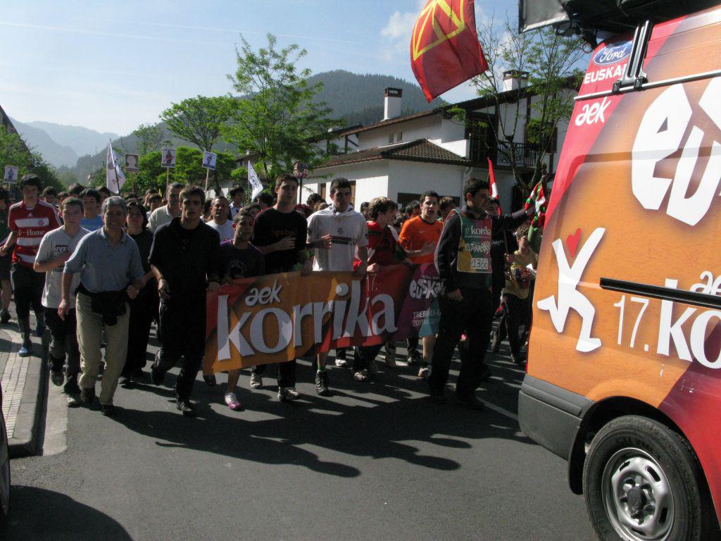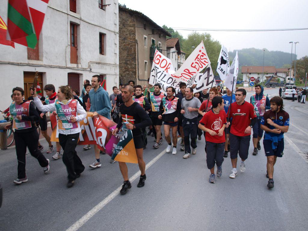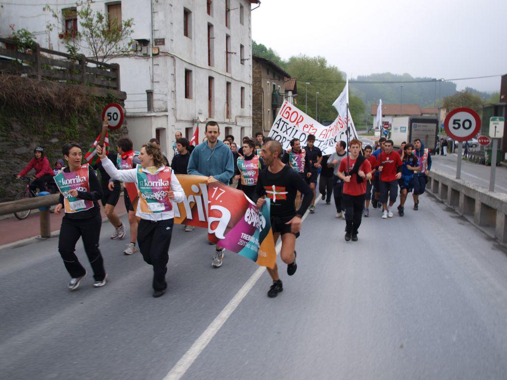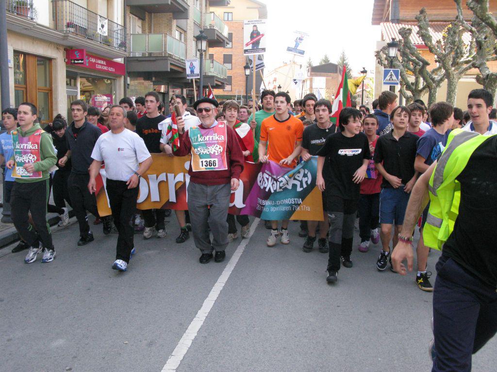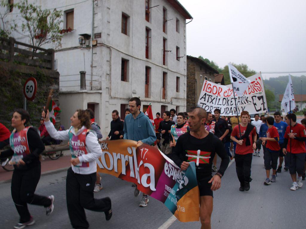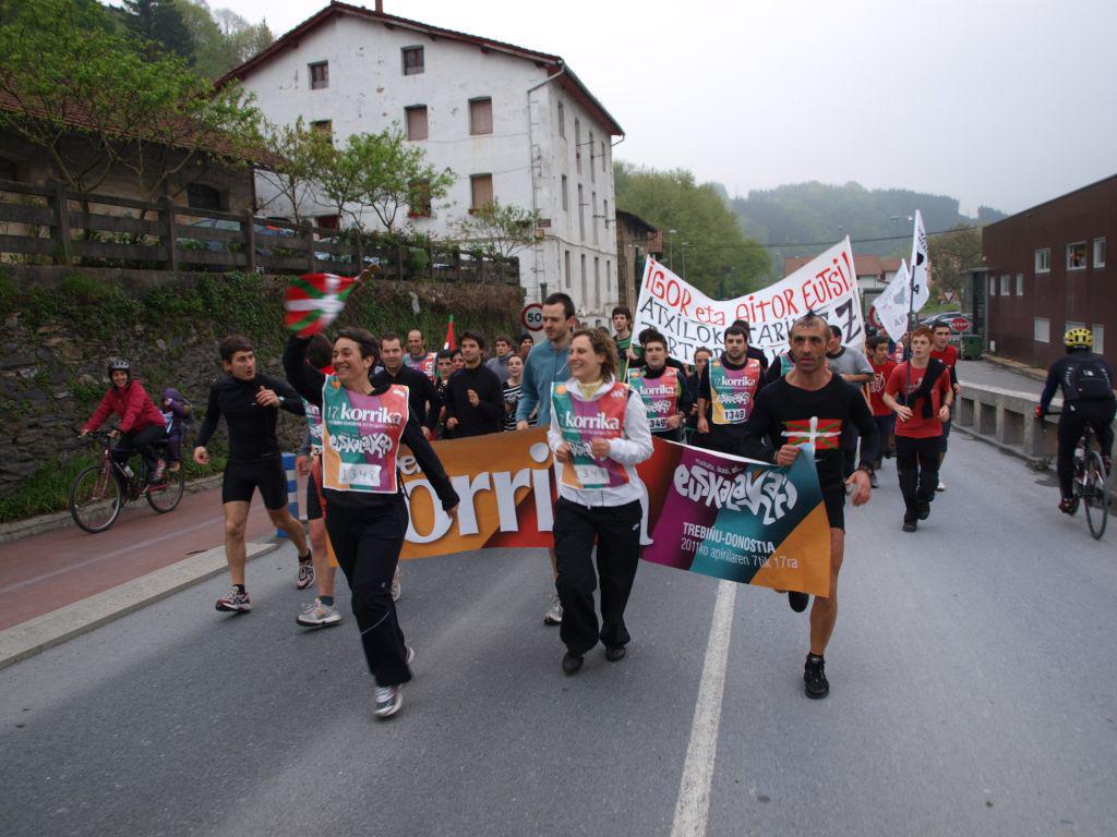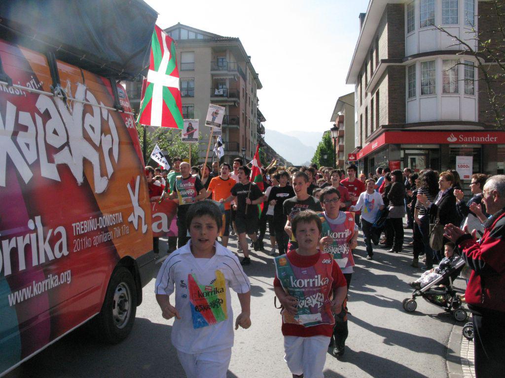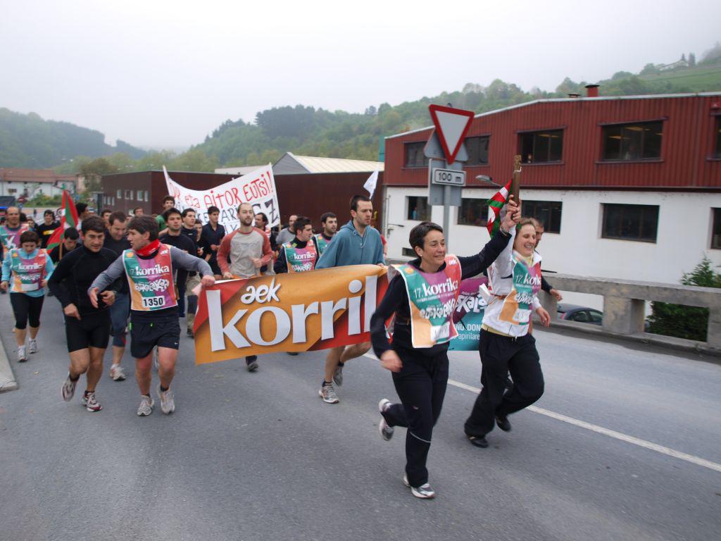 Korrika Goierrira iritsi da, 9:03 Korrika Legorretatik sartu da Goierrin, Donostiarako bidean. 40tik gora lagun iritsi dira lekukoaren atzetik, builaka eta pankartekin Korrika eginez. AEK-ko Legorretako ikasleak eta irakasleak izan dira Goierriko lurretan lekukoa hartu duten lehenak, Udalak erositako kilometroan. Korrikaren iritsieran urduritasuna sumatzen da, eta ekimena iritsi aurretik jende ugari ikusten da beroketak eta luzaketak egiten. Iragarritako orduan iritsi da Korrika Goierrira. Legorretar askok Eredu enpresa parean egin dute bat Korrikarekin. Atzo atxilotutako Esnaola anaiak ere gogoan izan dituzte Legorretarrek haiek askatzeko eskatzen zuen kartel handi batekin. Legorretako lehen kilometroa Korrikaren 1.348. kilometroa izan da.