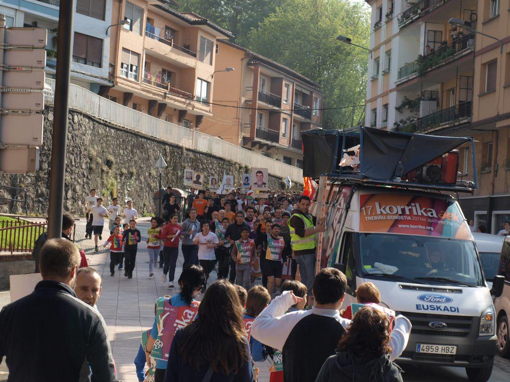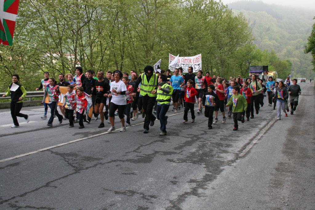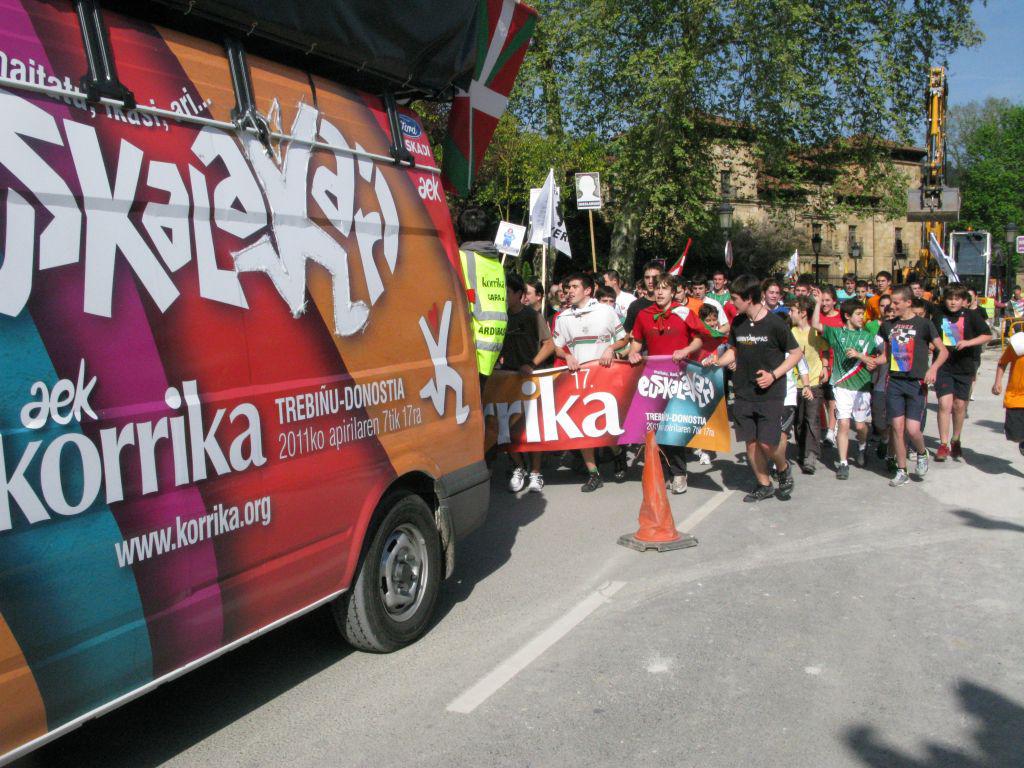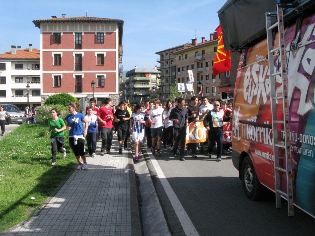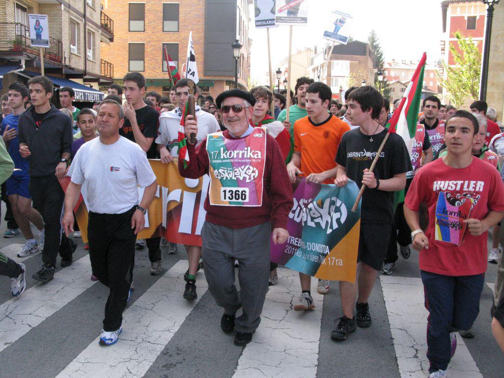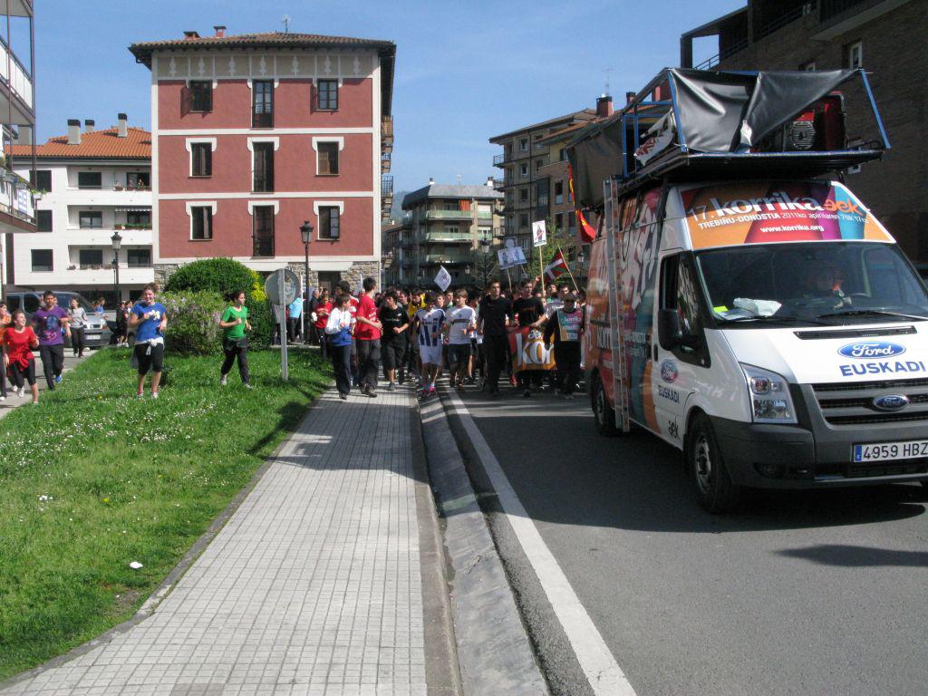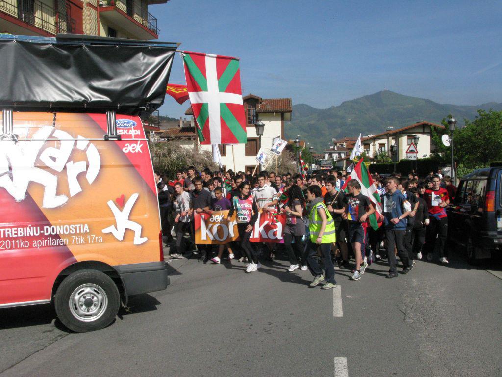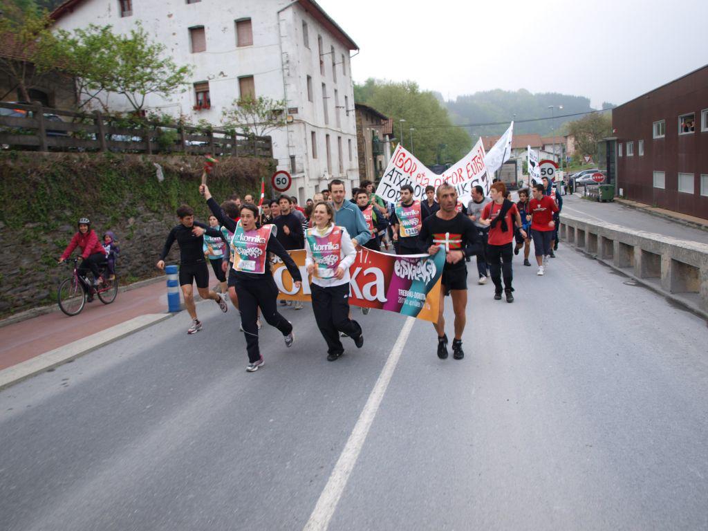 Korrika Goierrira iritsi da, 9:03 Korrika Legorretatik sartu da Goierrin, Donostiarako bidean. 40tik gora lagun iritsi dira lekukoaren atzetik, builaka eta pankartekin Korrika eginez. AEK-ko Legorretako ikasleak eta irakasleak izan dira Goierriko lurretan lekukoa hartu duten lehenak, Udalak erositako kilometroan. Korrikaren iritsieran urduritasuna sumatzen da, eta ekimena iritsi aurretik jende ugari ikusten da beroketak eta luzaketak egiten. Iragarritako orduan iritsi da Korrika Goierrira. Legorretar askok Eredu enpresa parean egin dute bat Korrikarekin. Atzo atxilotutako Esnaola anaiak ere gogoan izan dituzte Legorretarrek haiek askatzeko eskatzen zuen kartel handi batekin. Legorretako lehen kilometroa Korrikaren 1.348. kilometroa izan da.