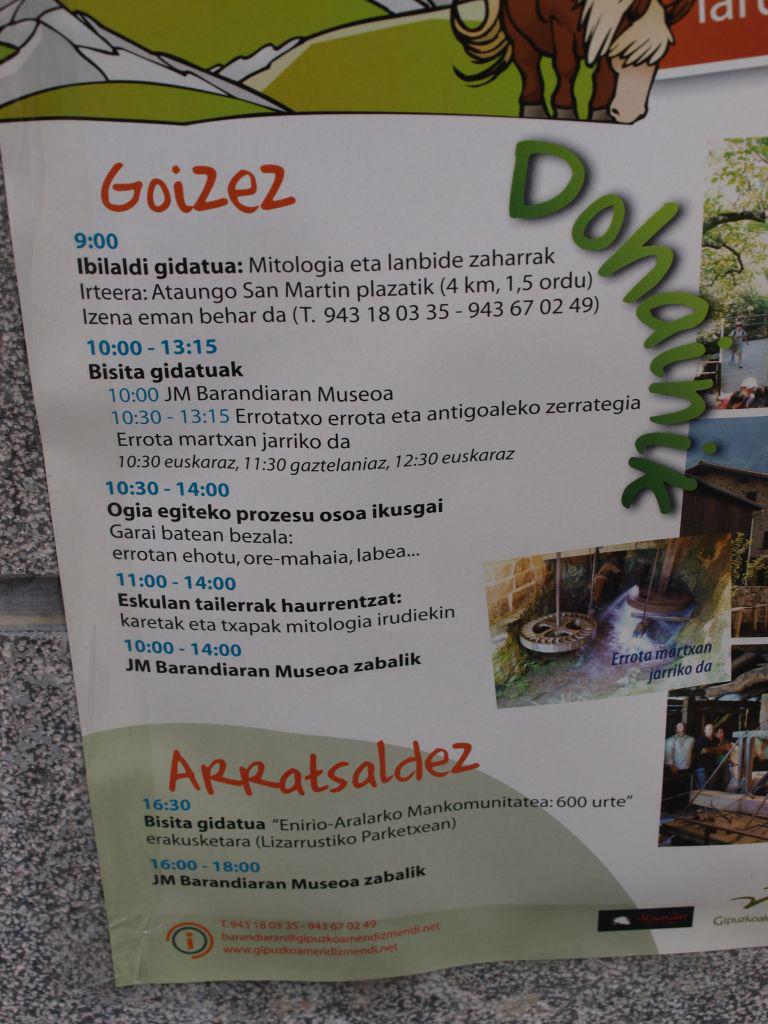10:00etatik 13:15era bisitaldi gidatuak eskainiko dituzte Barandiaran museoan. 10:30ean gainera, errota martxan jarriko dute.10:30etik 14:30era, bestetik, ogia egiteko prozesu osoa erakutsiko dute , eta tailerrak ere egingo dituzte, mitologia irudiekin karetak eta txapak eginez. Arratsaldean, 16:30ean, enirio Aralar mankomunitatea 600 urte izena eman dioten bisitaldi gidatua egingo dute Lizarrustiko parketxeko erakusketara.JM Barandiaran museoa ere zabalik egongo da 18:00ak arte.