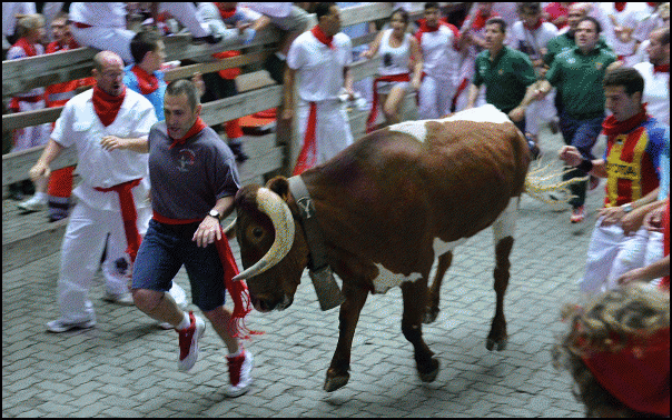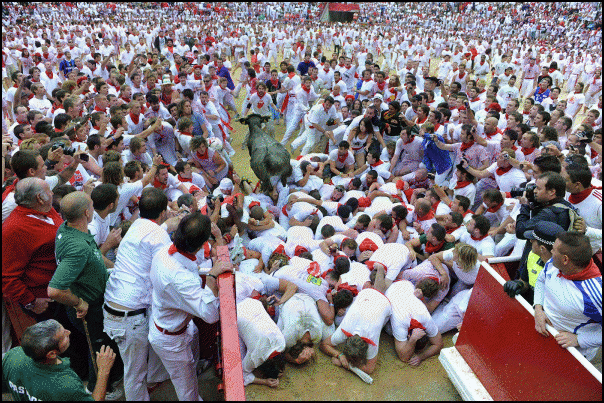 Leku batzuk 4:00etarako hartuta daude. Atzo zezenek irrist egitean jotzen duten barrerara joan nintzen. 6:55ean etorri eta ezinezkoa zen leku bat hartzea, baina gertu jartzea lortu nuen. Gaur ere hara joango naiz, baina lehenxeago. Leku horretatik guztiak parez pare hartzen ditut eta argazkia oso polita da. Agian gateretako argazkiren bat egiteko aukera izango nuela ere esan didate.