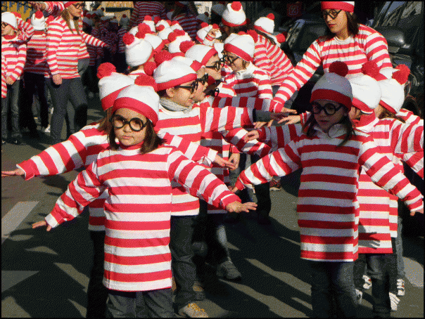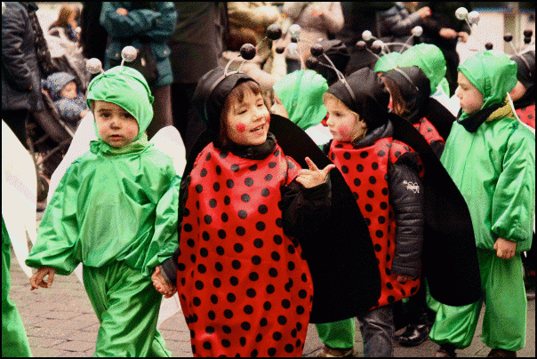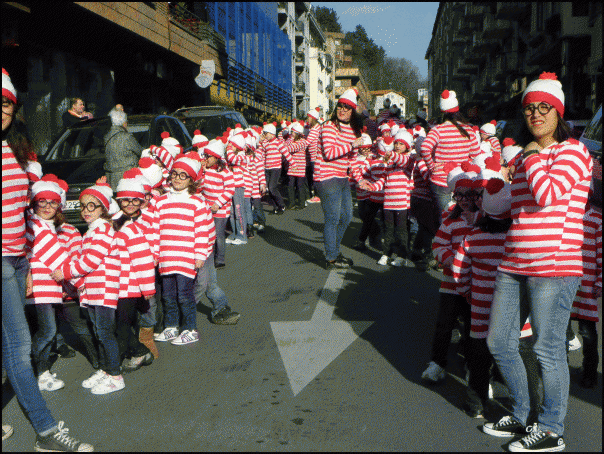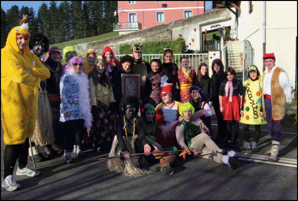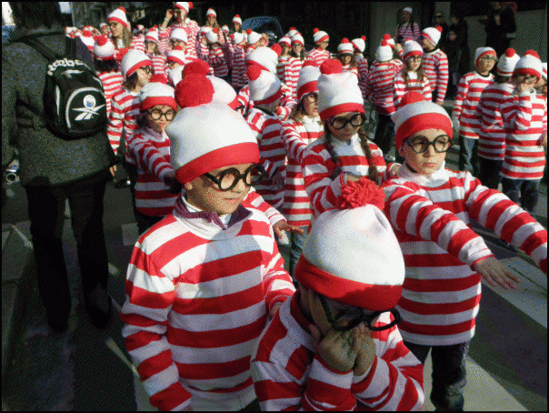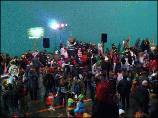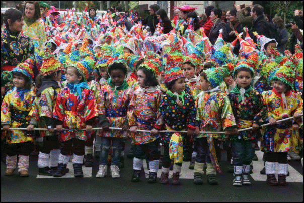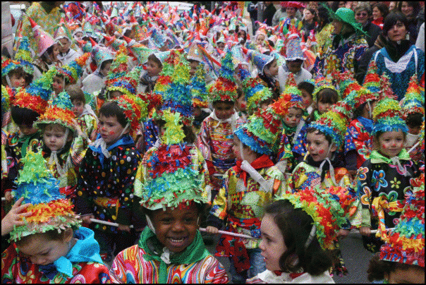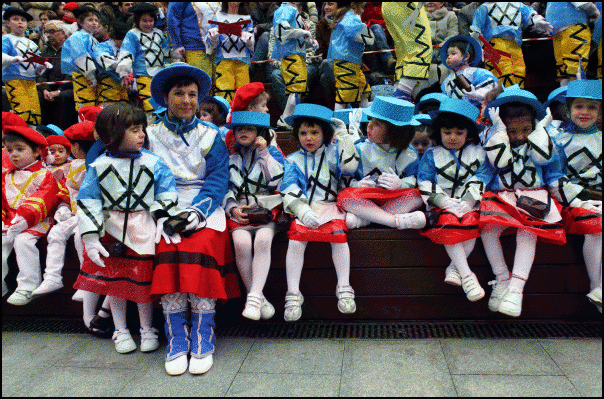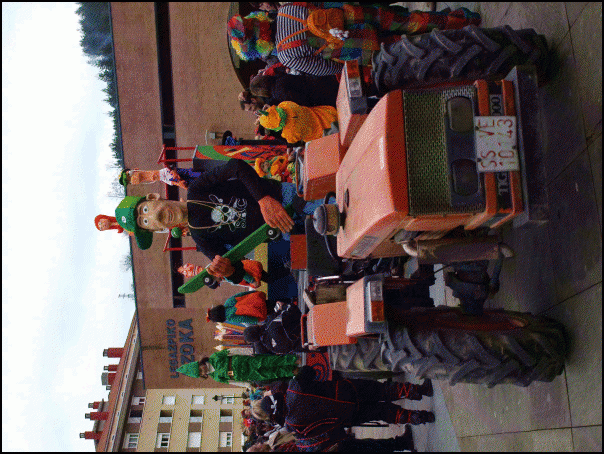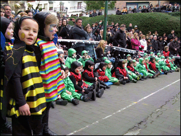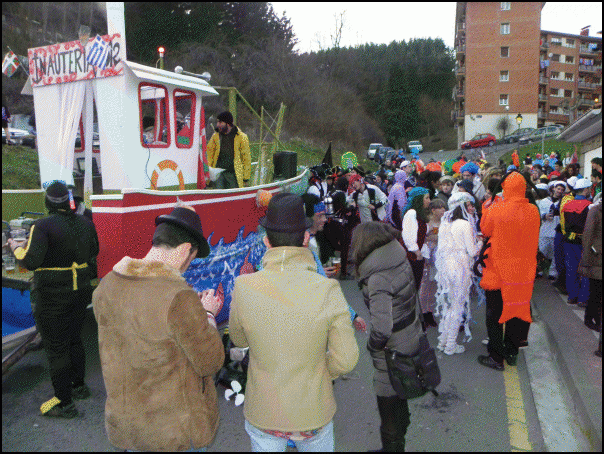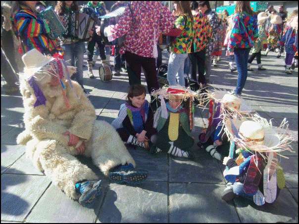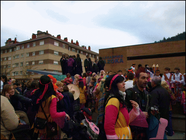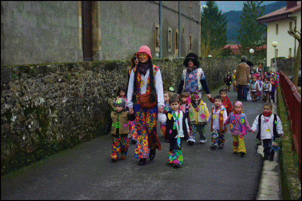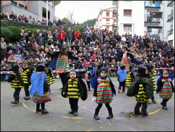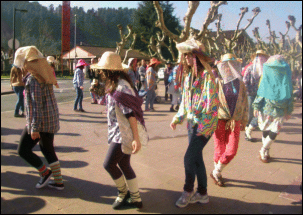 - Inauteriak Seguran. Laiotz Herri Eskolako ikasleak eta irakasleak desfilean Hippyz mozorrotuta.