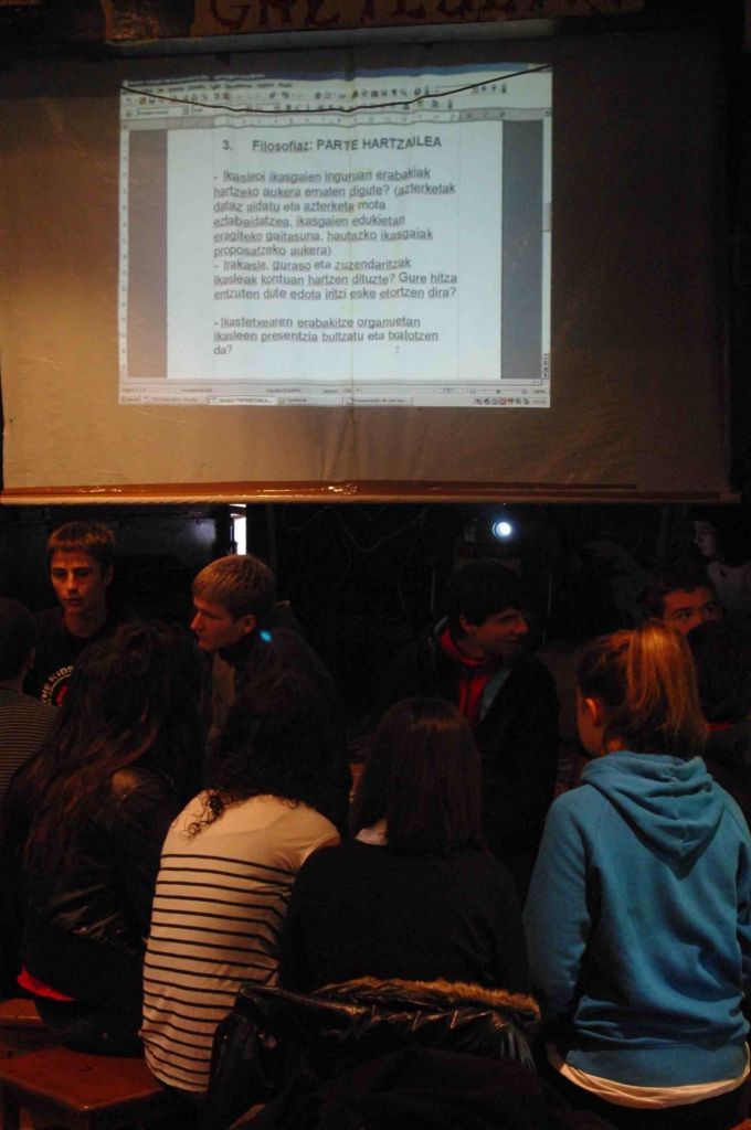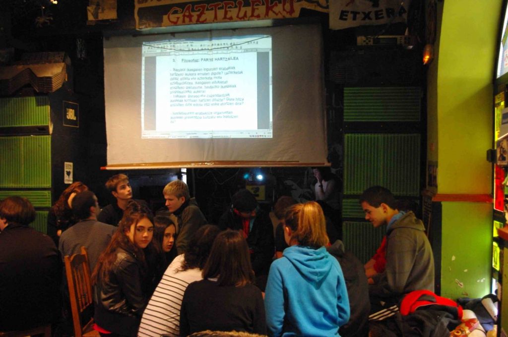 Norberak bere iritzia eman eta gainerakoena entzunda ari dira lanean, elkarrekin, ikasleen artean dauden hutsuneak aztertu eta horiek betetzeko eta osatzeko zein pauso eman daitezkeen aztertzeko. Ikasle diren aldetik, haiei eragiten dieten gaietan erabakiak hartzeko eskubidea aldarrikatzen dute, eta eskubide horien defentsan zein pauso eman daitezkeen aztertu dute goizean.