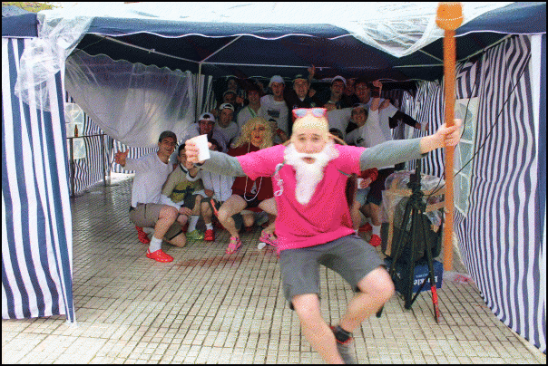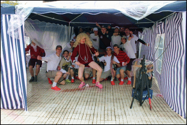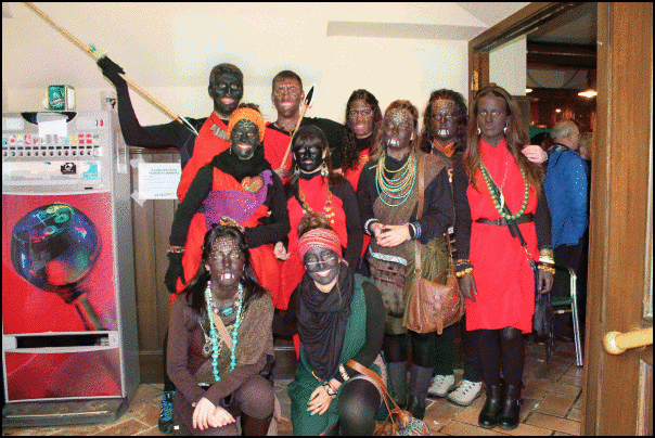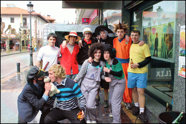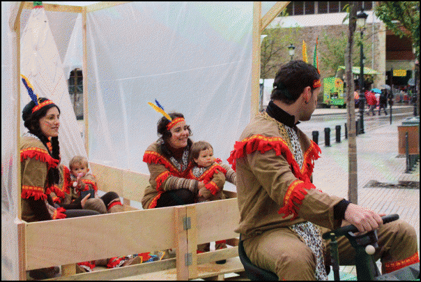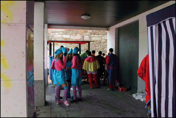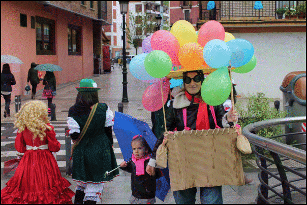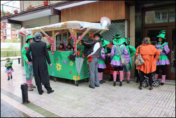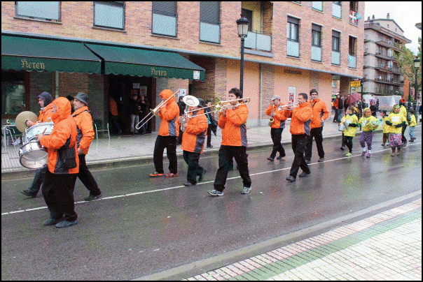 Jendetza dabil Lazkaoko kaleetan, festetako mozorro egunean. Askotariko mozorroak ikusteko aukera dago eta askok mozorroarekin erlazioa duten estalkiak ere badituzte. Estalkietako musika, tabernetakoa, autotxokeetakoa, txarangarena… Euriz eta musikaz bustitako eguerdia ari dira izaten.