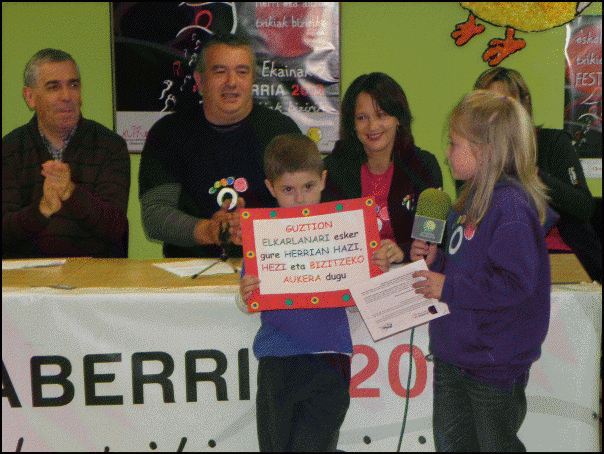 Bukatzeko, Maddi Amoztegi eta Iker Gonzalez haurrek paper handi batean idatzitakoa erakutsi eta ahots gora errezitatu zuten: «Guztion elkarlanari esker, gure herrian hazi, hezi eta bizitzeko aukera dugu».