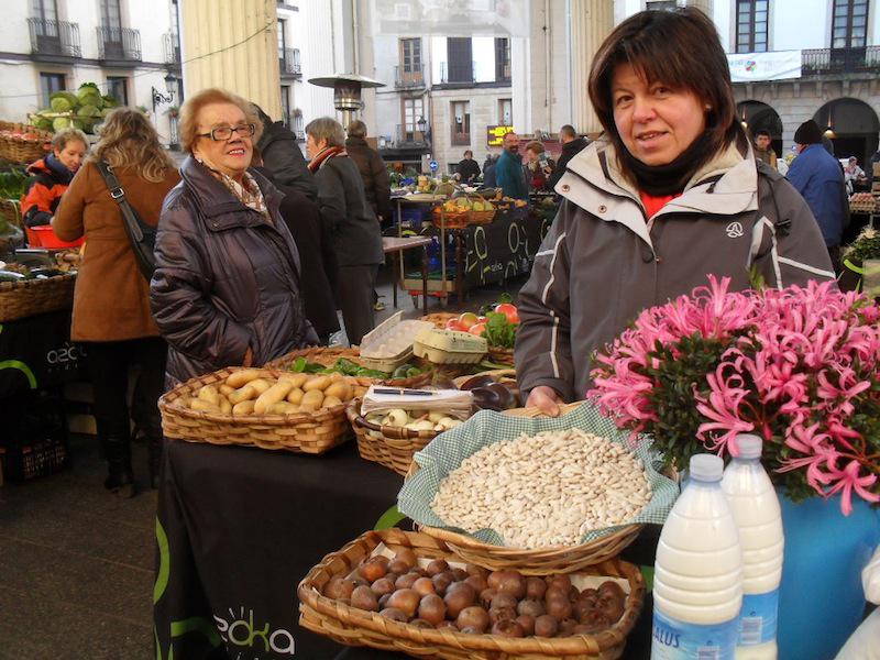 Garai hau ez da produktu berrietarako aproposena, baina halere, atzokoan sorta polita bildu genuen. Horietako batzuk dira: ardi esnea, txaiota, kakiak, erratza sortak eta nerine loreak. Ardi esnearen lehen litroak Aramako Zurutuza ahizpen postuan ikusi ditugu, 3,5 euroan zuten salgai 1,5 litroko ontzia, iazko prezio berean, alegia. Postu horretan bertan, hemen hain ohikoak ez diren babarrun zuri handiak ere ikusi ditugu, Asturias aldean berriz oso preziatuak dira horiekin egindako fabadak; «handik ekarritako hazia da, aihena eta sustarrak lodiagoak ditu, bestela gainerako babarrunaren oso antzekoa da landarea» azaldu digu Arantxak; kiloa 15 euroan dago salgai. Eta garai honetan loratzen den Nerine deritzanaz egindako lore sortek dotoretzen zuten postua.