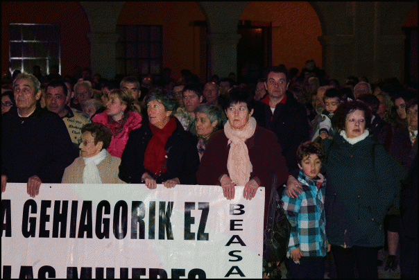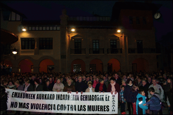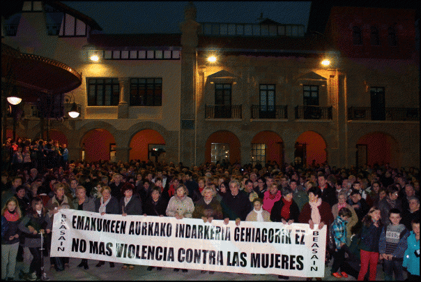 http://youtu.be/0W1YzLs0riY Beasaingo plaza jendez bete da 19:00ak jotzerako, joan den ostiralean gertatu zen sexu erasoa salatzeko. Asmube elkarteak deitutako kontzentraziora ehunka herritar gerturatu da, "Emakumeen aurkako indarkeria gehiagorik ez" leloa zeraman pankartaren ingurura. Hamabost minutuko kontzentrazio isila izan da eta amaieran txalo egin dute denek.