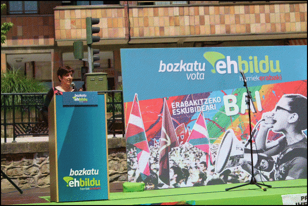 Maite Ubiria izan da lehena hitza hartzen. Gaurkoan eguzkia indarrez egonagatik, “hodei beltzak” ugari direla nabarmendu nahi izan du Ubiriak. Langabezia, pobrezia zein prekarietatea Europan zabaldua dagoela salatu du. EAJ, PSE zein PPren gainean harreta jarriz azaldu duenez, “nabarmena da beste eredu bat dutela, egunero sufritzen dugu-eta”. Horren aurrean, EH Bilduren erronka justizia sozialarena dela esan du Ubiriak. “Eredu berri honek boto errebeldea, parekidea, gaztea, euskalduna eta langilea behar du aberria aldatzeko. Gaur goizean Hendaian egon naiz. Hendaia, Lapurdi. Euskal Herria, zazpiak bat”, esan du.