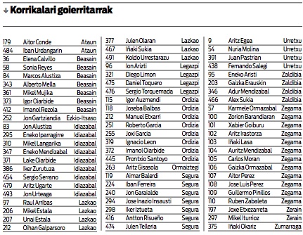 «Berezko dohainez gain, oso garrantzitsua da ibilbidea ondo ezagutzea» Alberto Aierbe (Zegama-Aizkorri maratoiaren antolatzailea)Horiekin batera,Tadei Pivk eta Marco De Gasperi italiarrak, Zaid Ait Malek andaluziarra, Cameron Clyton estatubatuarra edota Ton Owens eskoziarra dira garaipena lortzeko aukera gehien dituztenetariko batzuk. Euskaldunei dagokienez , Lizeaga (Urnieta, Gipuzkoa) Hassan Ait Chaou Ait Chaou (Villabona, Gipuzkoa) eta Aritz Egea (Urretxu) lehen hamar postuetan ibiliko direla uste du Aierbek, izan ere, Zegama-Aizkorriko antolatzailearen iritziz lasterketan ondo ibiltzeko, «berezko dohainez gain, oso garrantzitsua da ibilbidea ondo ezagutzea, eta zinez, hiru hauei ez zaizkie arrotz Aizkorriko parajeak». Emakumeen lasterketan, hutsune nabarmen bat izango da aurtengoan: Oihana Kortazar elgetarra ez da lasterketan izango. Emilie Forsberg norvegiarra, aldiz, Zegaman izango da. Iazko txapelduna «ondo» ibiliko delakoan dago Aierbe, baina beste kirolari askok ere aukerak dituztela uste du «Maite Maiora mendaroarra, esaterako, lehen postuetarako lehian ibiliko da». Maioraz gain, kontuan hartzekoak dira iazko bigarren eta hirugarren sailkatuak, Stevie Kramer, eta Nuria Picas, hurrenez hurren; Kasey Enmon, edota Elisa Desco ere, besteak beste. Gazteen mendi maratoia Ospea helduen lasterketak badu ere, Zegaman beste lasterketa bat ere egiten da: Zegama-Aizkorri Junior Trail. Aurtengoa hirugarren edizioa izango da, eta 16 eta 18 urte bitarteko 42 korrikalarik hartuko dute parte, tartean, zazpi mutil goierritar izango dira. 10:30ean ekingo diote lasterketari, eta 10,2 kilometroko ibilbidea egingo dute.