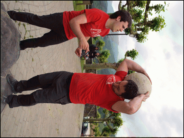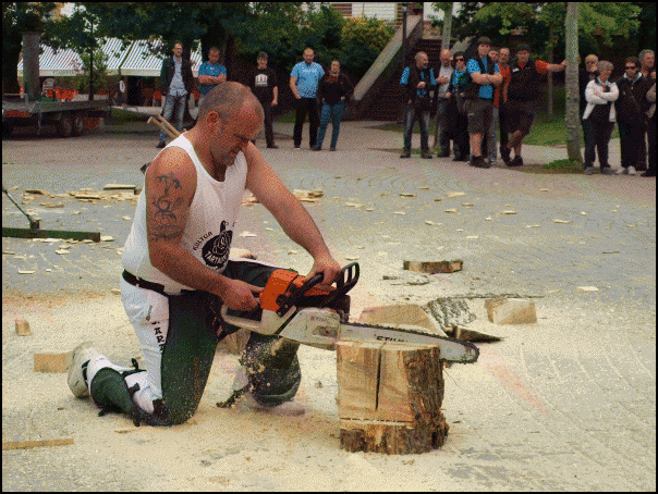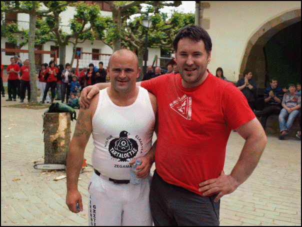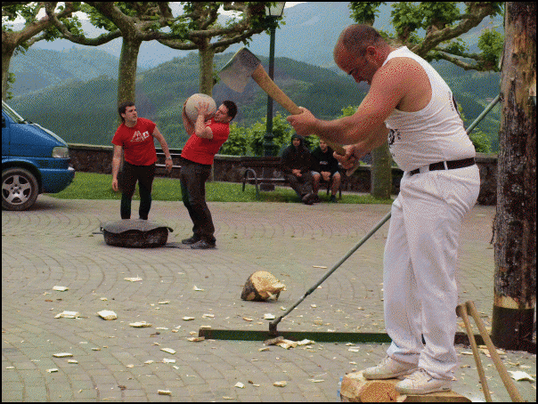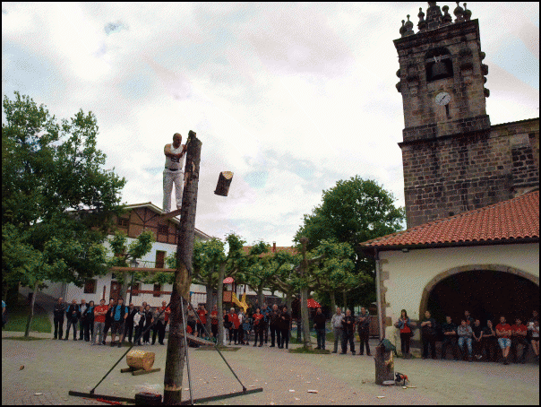 Bestetik, Joxe Mari Esnaola zegamarrak eta Gabiriako Eñaut Igartzabalek herri kirol erakustaldia egin dute, plazan. Esnaolak zutitutako enborrari bi korte jo dizkio, 5,5 metroko garaieran. Ondoren, oinbikoa ebakitzen zuen bitartean Igartzabalek 100 kiloko bolari 16 altxaldi emateko desafioa burutu dute. Harri jasotzaileak 24 altxaldi eman dizkio. Bukatzeko, Esnaolak motozerrarekin egur enbor bat aulki bihurtu du.
