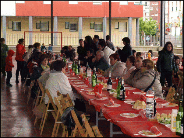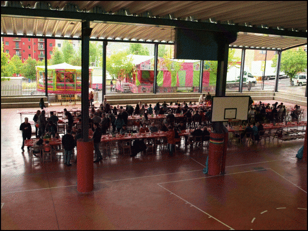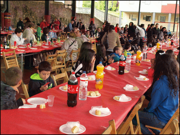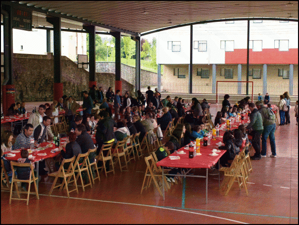Ondoren, auzoko estalitako kirolgunean bildu dira zahar eta gazte, haur eta larri. Bazkaria egin dute, auzotarrek prestatuta. 142 larri eta 64 haur ziren. “Hasierakoak eta lehen platera auzotarren artean prestatzen dugu. Gainerako arkume errea dugu, eta hori jada kanpotik eginda ekartzen dugu”, zioen bazkariaren antolatzaile Pedrok.