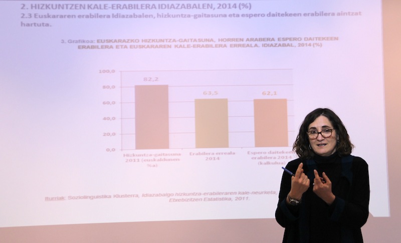 2014ko urriko bigarren astean garatu zuten ikerketa, eta atzo azaldu zituen datuak Belen Uranga Soziolinguistika Klusterraren taldeko kide eta ikerketa arduradunak. Horretarako kalean egindako 1.102 elkarrizketei erreparatu diete, eta horietan solaskide izan diren 3.167 herritarrek osatu dute lagina.