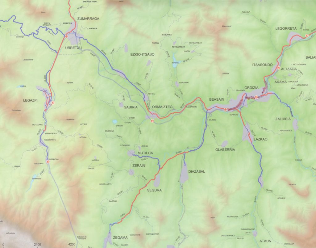 Goierriko bidegorriak 2015 martxoan. Gorriz, eraikitako zatiak; urdinez, aurreikusitakoak.