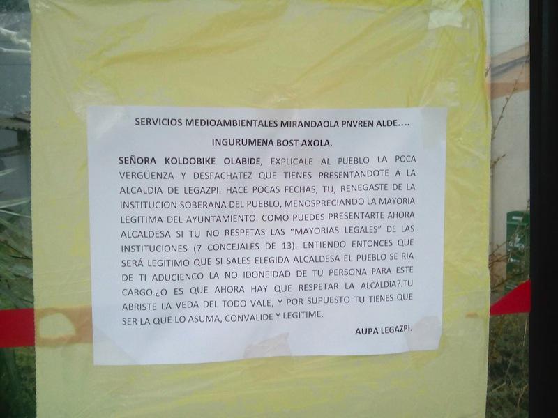 Olabidek “lotsa gutxi” duela diote, sinatu gabeko karteletan. “Duela gutxi herriaren instituzio subiranoa ukatu zenuen, udaleko gehiengo legitimoa mesprezatuz. Nola aurkeztu zaitezke alkatetzara instituzioetako gehiengo legalak errespetatzen ez badituzu (13 zinegotzitik 7)? Alkate hautatzen bazaituzte, herriak, kargurako ez zarela egokia argudiatuz, zutaz barre egitea bidezkoa izango da beraz. Ala orain alkatetza errespetatu behar al da? Zure arabera denak balio du eta, beraz, onartu egin beharko duzu”.