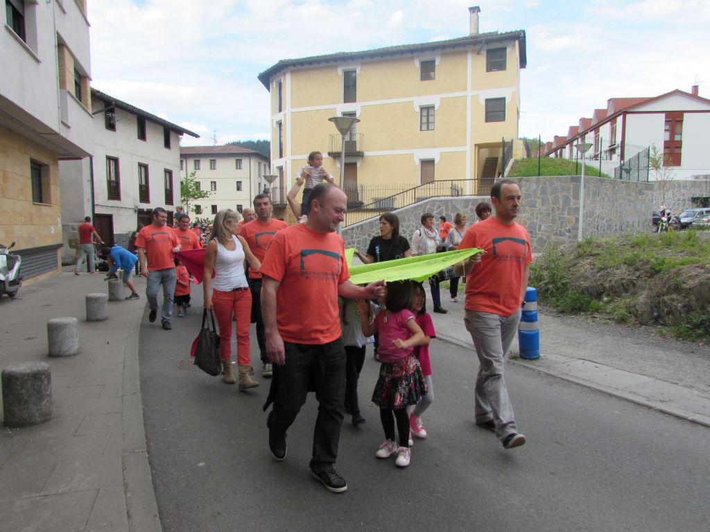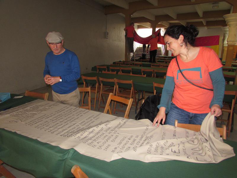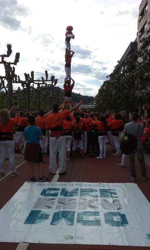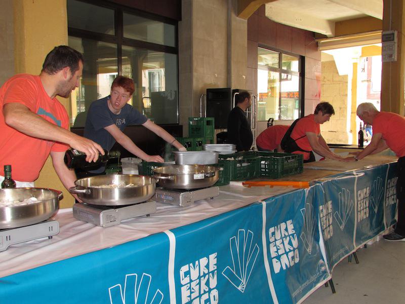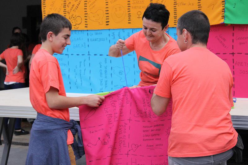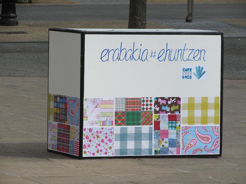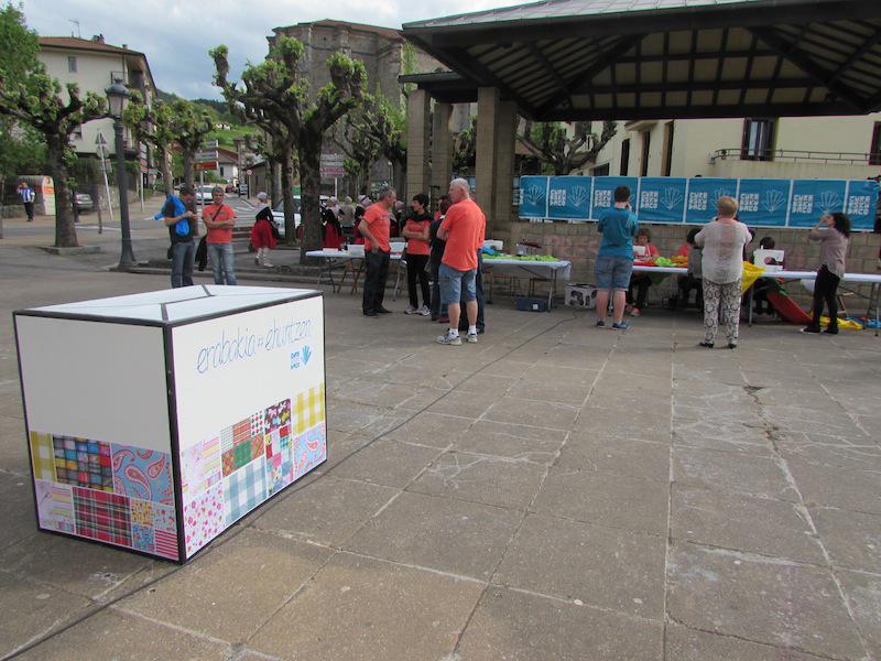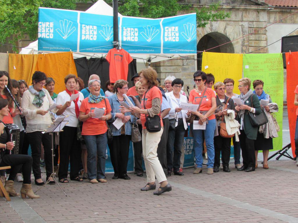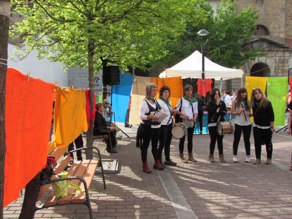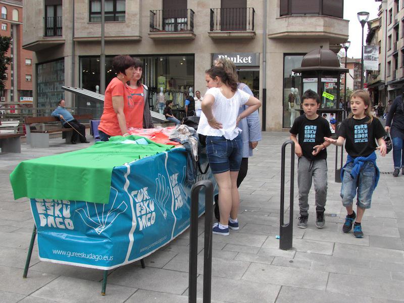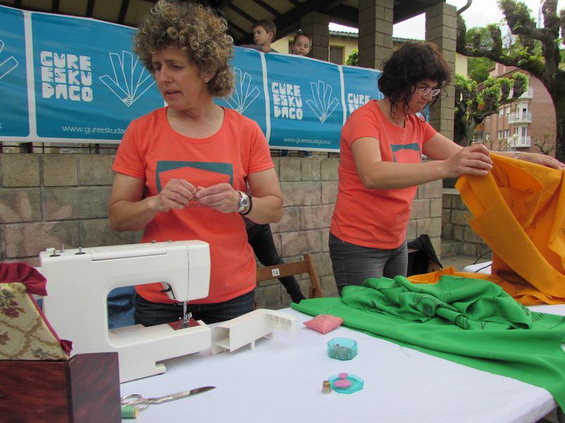 Beasainen oihalak banatzen eta materiala saltzen egon dira goizean, orain elkarrekin bazkaltzeko hitzordua dute plazapean. Bazkal aurretik erabakitzeko eskubidearen aldarria margotuta duten oihalekin apaintzen ari ziren bazkariaren gunea. Arratsaldean castellersek, buruhandiek, trikitilariek… segida emango diote Gure Esku Dagoren Joste Eguneko jaiari eta 19:00etan sagardo eta basatxerri dastaketa egingo dute Bideluzen.