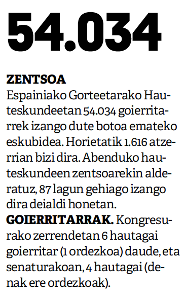 Hauteskunde deialdi honetarako 54.034 goierritarrek izango dute botoa emateko eskubidea. Goierrin bertan erroldatuta daudenak dira gehienak. 52.418, eta atzerrian bizi direnak gainontzeko 1.616 goierritarrak. Abenduko azken deialdiarekin alderatuta, 87 lagun gehiagok eman ahal izango dute botoa.