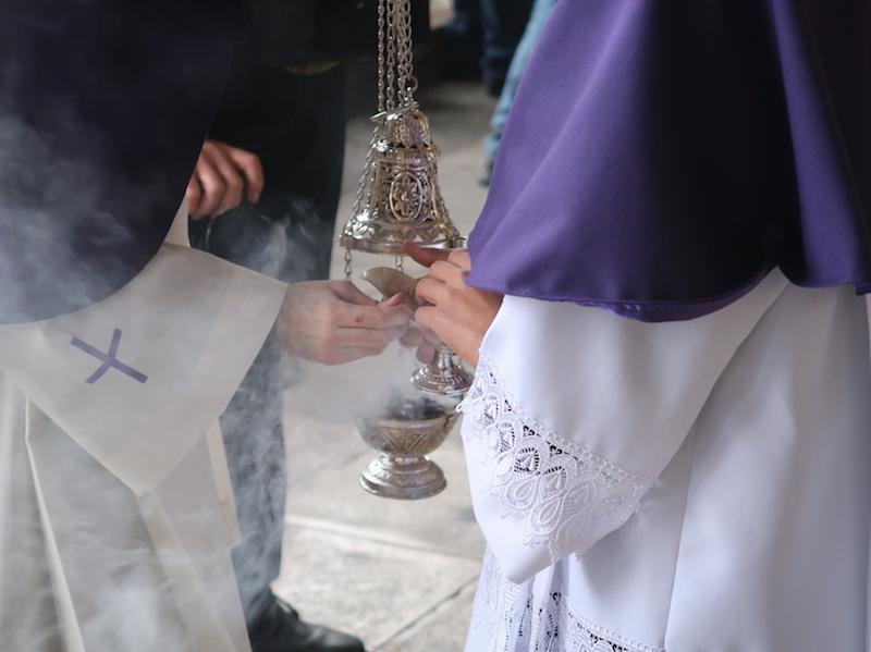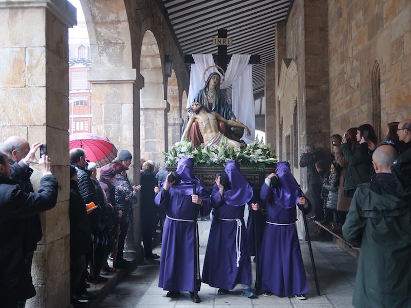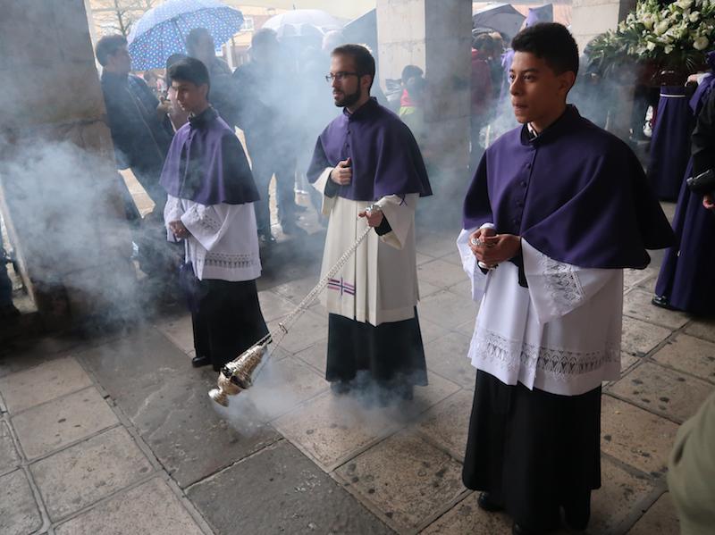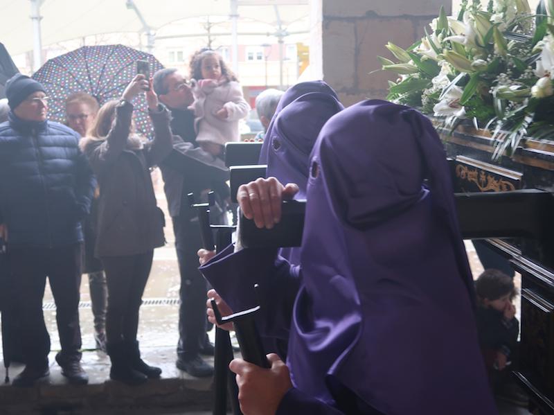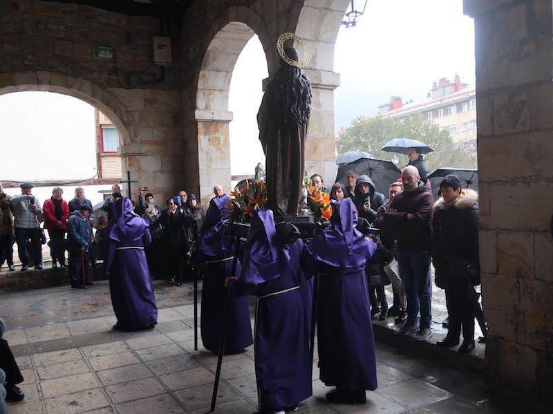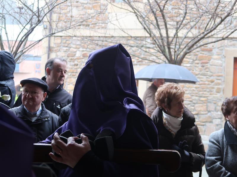 Nafarroa Kaletik irten eta Kale Nagusitik itzultzekoa zen prozesioa, baina euria dela eta elizako arkupean egin behar izan dute. Katekesia egiten ari diren haurrek parte hartu dute, eta familia osoak ere atera dira. Prozesioa gaur egiteko erabakia hartu zuten, alde batetik Segurakoarekin talka egin ez zezan, eta bestetik, prozesioaren egunean Aste Santuan oporretara joatekoak direnak oraindik bertan egon zitezen.