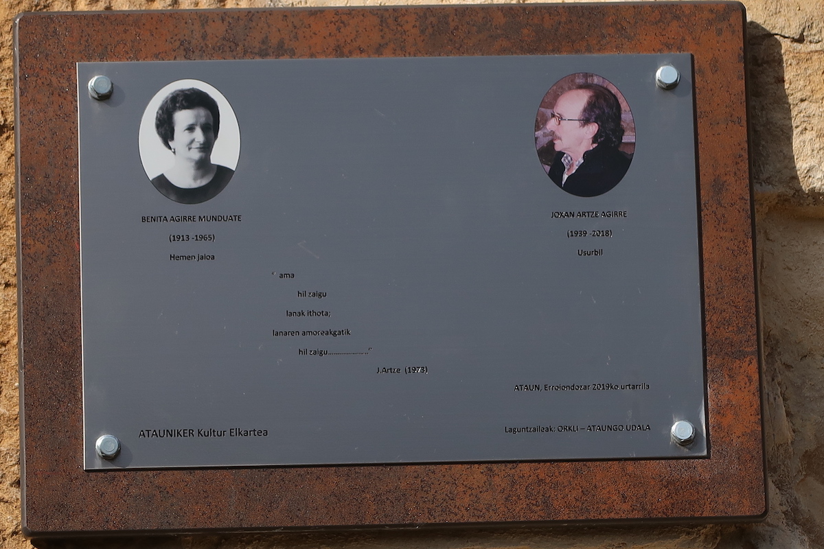 - Benita Agirreren eta Joxan Artzeren omenezko plaka, Erroiondozarren./A.Maiz