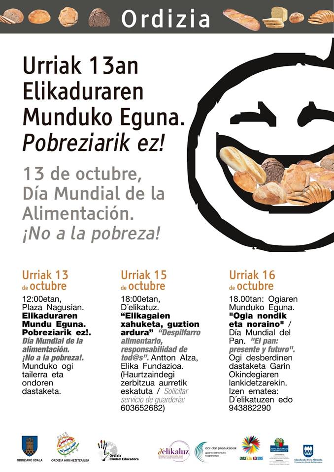 Igandean, urriak 13, ospatuko dute ordiziarrek elikaduraren mundu eguna, Pobreziarik ez! lemapean. Modu berezian ospatuko dute, munduko ogiak egiten. Ordizian bizi diren Senegalgo, Algeriako, Marokoko eta Txileko herritarrek haien herrial- deetako ogiak prestatuko dituzte 12:00etatik aurrera. Ondoren dastaketa egingo dute eta herritarrek, prezio oso onean ogiak erosteko aukera izango dute. Salmentarekin eskuratutako dirua, Elikagaien Bankuari emango diote, behar gehien duten elikagaiak erosteko. Gainera, goiza girotzeko musika ez da faltako.