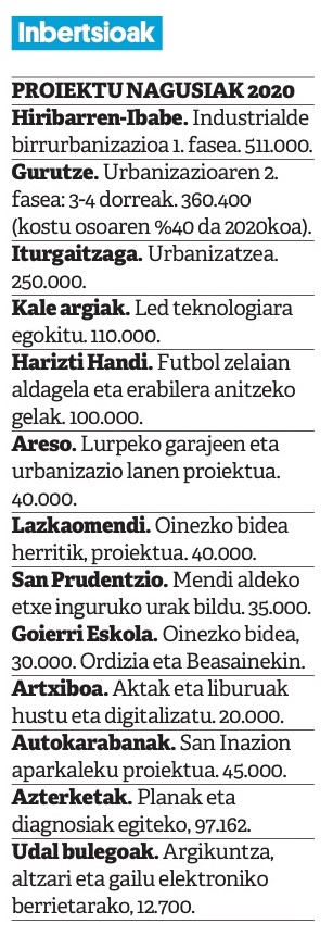 Inbertsioetarako 1.502.600 euro jarri dituzte. Kopuruz handienak urbanizazio lanetarako eta kale konponketarako izango dira: Hiribarren-Ibabe industrialdea, Gurutzeko 2. fasea, eta Iturgaitzaga. Gurutzen, 3-4 dorreetako plazaren azpian lurpeko garajeak eraikitzeko eskaria ere aztertuko dute. Antzeko asmoa garatzeko aukera eskainiko dute Aresoko aparkalekuan ere.