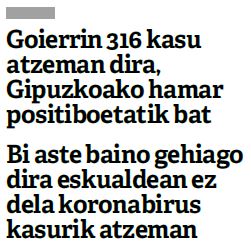 Beraz, hiru hilabete baino gehiago egongo da alarma egoera indarrean, udaberri osoan. Martxoaren 15ean ezarri zen, neguko azken asteburuan, eta urtaroko azken asteburuan kenduko da. Goierritarren oinarrizko eskubideak mugatuak egon dira denbora tarte horretan, Espainiako Gobernuari horretarako eskumena ematen dion tresna juridikoa baita alarma egoera. Kasu honetan, eskubideen murrizketen helburua jendea etxeetan bakartzea zen koronabirusaren hedapena gelditu eta osasun zerbitzuak kolapsatu ez zitezen. Goierrin helburua bete da: Zumarragako Ospitaleak ongi eutsi dio erauntsiari nahiz eta eskualdean 316 kasu atzeman diren eta 35 pertsona hil diren osasun sailak emandako informazioaren arabera. Maiatzaren 16tik ez da kasu berririk agertu.