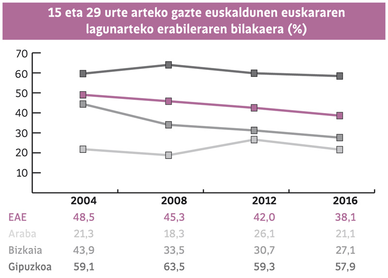 Hamabost eta 29 urte bitarteko gazte euskaldunen artean euskararen erabilerak behera egin duela erakusten du Gazteen Euskal Behatokiak iazko martxoan argitaratu duen Euskadiko Gazteen Egoeraren diagnostikoak. Daturik positiboenak Gipuzkoakoak dira, hamarretik seik erabiltzen baitute gehienetan euskara lagun artean. Euskal Autonomia Erkidegoko (EAE) batez bestekotik bi puntu gorago dago Gipuzkoako datua; adierazle horretan sartzen dira dena edo ia dena euskaraz egiten dutela diotenak, euskara gaztelania baino gehiago erabiltzen dutenak eta bi hizkuntzak berdin erabiltzen dituztenak.