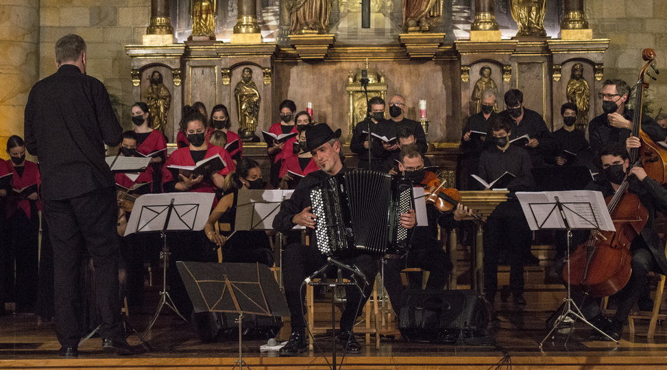 Gorka Hermosa akordeoilariak Urretxutik mundura obra aurkeztu zuen igande arratsaldean Urretxuko San Martin de Tours parrokian, punta-puntako artistek lagunduta.