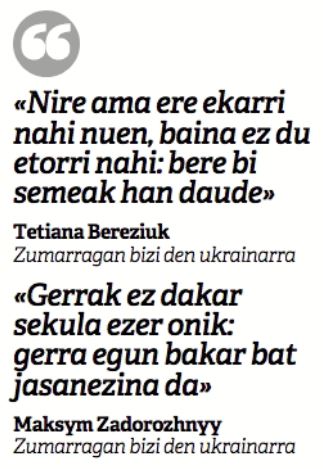 Zadorozhnyy-k 32 urte ditu eta duela 20 urte atera zen Ukrainatik, gurasoekin, bizimodu hobe baten bila. Gurasoak gertu ditu eta ez du anai-arrebarik, baina bera ere sufritzen ari da. «Jaioterria gerran egotea oso gogorra da. Gurasoak hemen daude, baina senitartekoak eta lagunak ditut Ukrainan. Oso kezkatuta nago. Oraingoz, ez dute gure herria erasotu. Hiri txiki bat da eta, dirudienez, ez zaie asko interesatzen. Baina ez dago jakiterik. Egoera edozein unetan alda daiteke. Ea hau lehenbailehen amaitzen den. Hitz egin dezatela. Gerrak ez dakar ezer onik: gerra egun bakar bat jasanezina da. Jendea hiltzen dute, hiriak deuseztatzen dituzte… Gerra egun bakarra, eternitatea da. Beti bezala, jende pila bat hil ondoren, hitz egiten hasiko dira. Alderantziz egin behar da. Hitz egiten konpontzen dira gauzak».