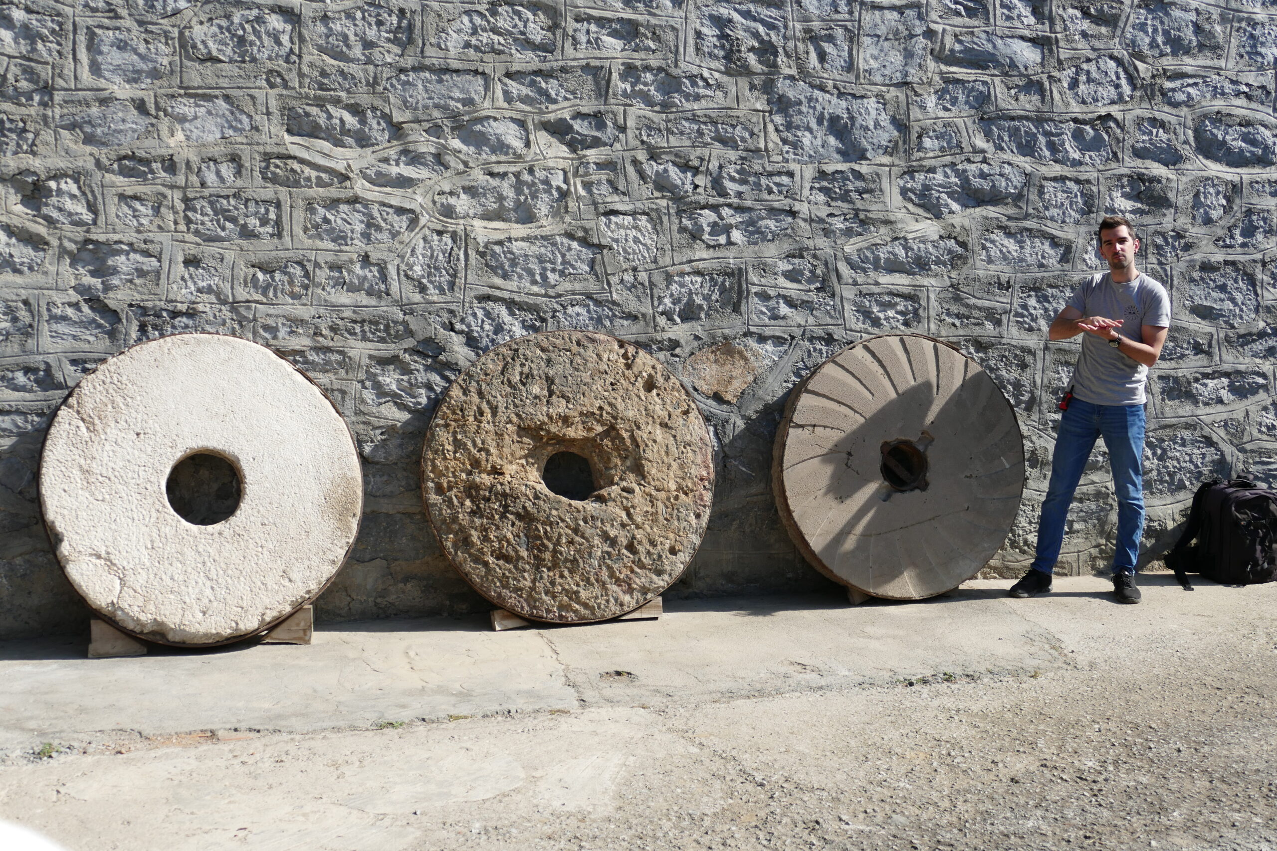 Bisitariek Ibares errotaren funtzionamendua bertatik bertara ezagutu ahal izan dute. / A.Garmendia XV. Mendekoa da Aramako Ibares errota. Oria ibaiaren ertzean dago, nazional zaharraren azpian eta trenbidearen alboan. “Askok Itsasondo dela pentsatzen dute, baina muga ibaiak egiten du”, azaldu du Mikel Cobos Irizarrek. Berak egin ditu gida lanak familiako errotan. Laugarren belaunaldia du Irizar familiak Ibaresen, 1927tik daude bertan. Ordutik, zenbait errotarri erabili dituzte. Horietako hiru eraikinaren alboan daude, N1 errepide zaharra igarotzen zen zubiaren zutabeetako baten kontra. “Kareharrizkoa da bat, Trebinukoa; erdikoa Usurbilkoa da, harri konglometratukoa eta bestea Idiazabalkoa, granitozkoa”, jakinarazi du Cobosek.