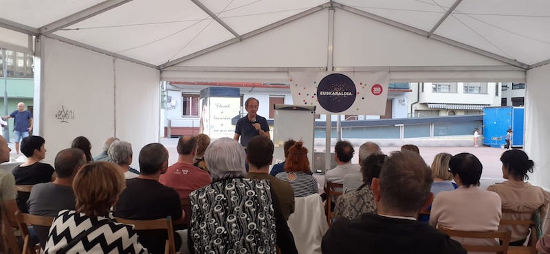Kike Amonarrizek Euskaraldiaren Urretxu eta Zumarragako herri batzarrean parte hartu zuen atzo. Zergatik euskaraldia? galderari erantzun zion. Dozenaka herritar inguratu ziren Zelai Ariztiko karpara.