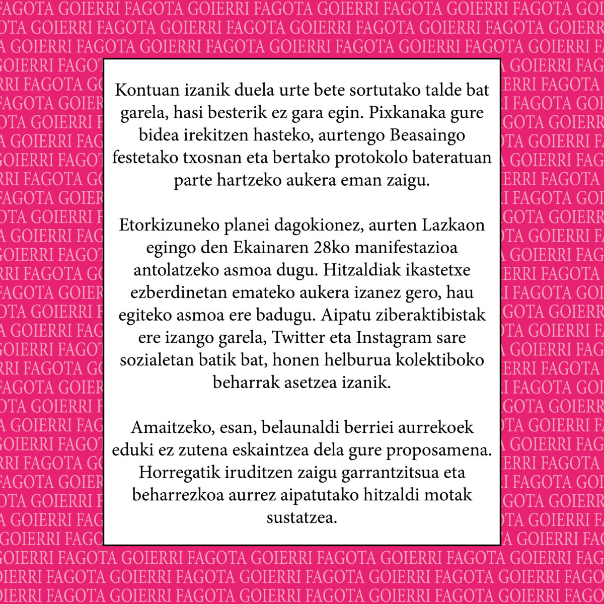Ekainaren 28a, LGTBI+ Harrotasun Egunean, 19:00etan hasita, LGBTIQ+ komunitatearen eskubideen aldeko manifestazioa antolatu du Goierri Fagota taldeak. “Lazkaoko kaleak hartuko ditugu eta ikusgarritasuna emango diegu gure partaideei”.