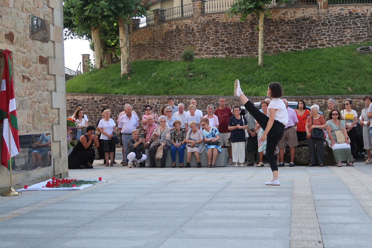 Ane Garmendia dantzaria Bujanda eta Lasa Plazako plaka loratuaren aurrean Agurra egiten. // Argazkia: Aimar Maiz Uztailaren 18a atzo, beste garai batean bestelako konnotazioa zuen data, Olaberriko Oroimen Historikoaren Eguntzat gogoratu dute Olargi taldeak eta udalak. Ostiral iluntzean egin zuten aurtengo ekitaldia, bereziki emakumeek jasandako errepresio politiko-sozialean eta sufrimenduan arreta jarrita.