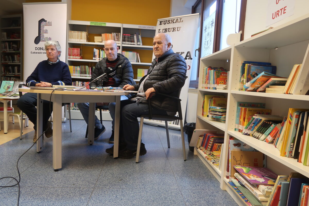 Joxepa Madariaga (Lazkao), Aitor Aldasoro (Ataun) eta Xabier Albizu (Segura), Goierriko liburu eta disko azokak aurkezten, gaur goizean, Seguran. /Aimar Maiz