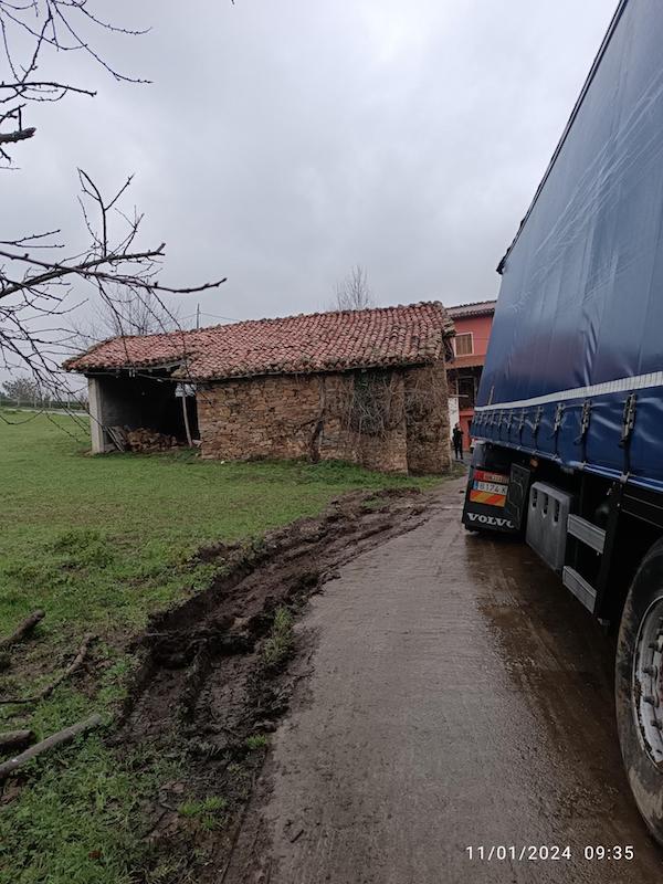 Kamioi bat kateatuta geratu da Idiazabalgo Urrutikoetxea baserri parean