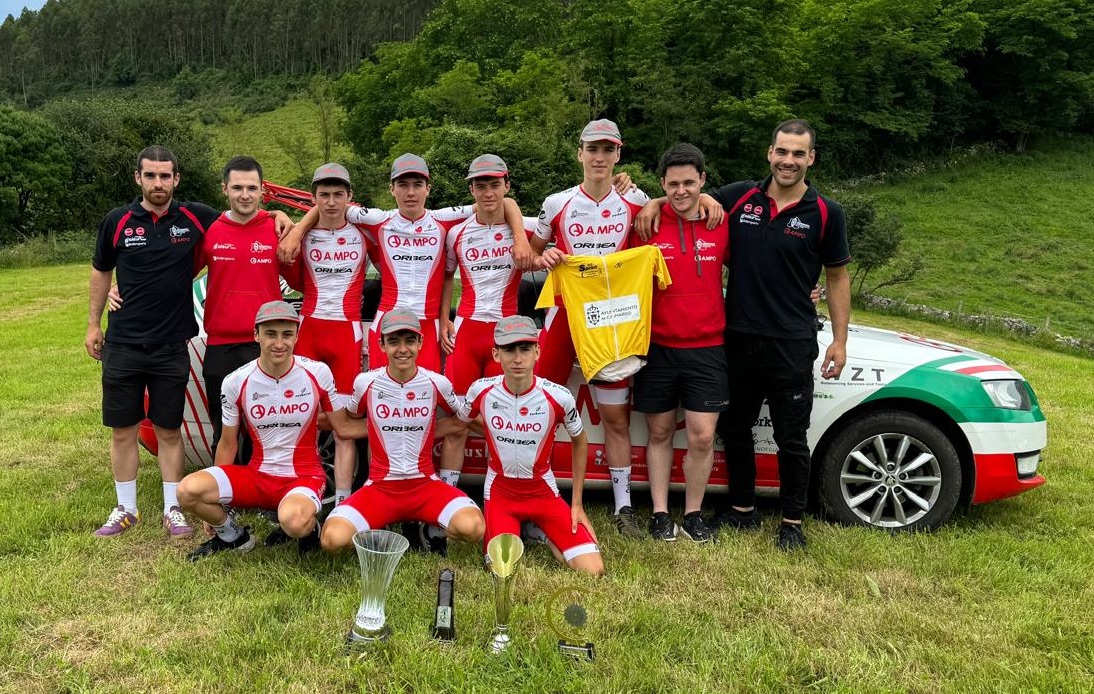 Kepa Ormazabal elastiko horiarekin, taldekide eta zuzendariekin. Kepa Ormazabal (Ampo) txirrindulari gabiriarrak irabazi du San Pantaleonen jokatu den Kantabriako Junior Zirkuituko hirugarren eta azken etapa. Ormazabalek sailkapen nagusia ere irabazi du.