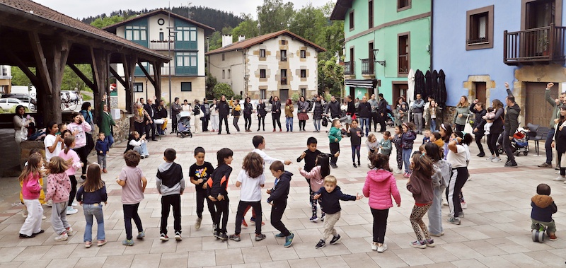 Eskolatik herrigunera lekualdatu zen arratsaldean festa. Eliza aurreko plazan elkartuta beste dantza saio bat egin zuten helduek zein haurrek eta elkarrekin mural koloretsu bat ere sortu zuten.