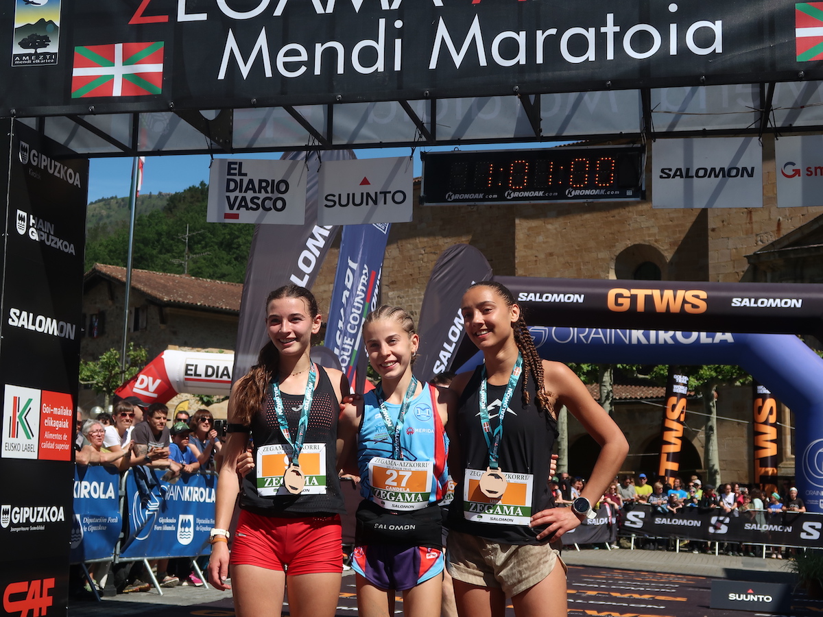 Ezkerretik eskuinera, Laia Alonso, Candela Perez eta Uma Plans, helmugan.Laida Goiburu Biel Sagues kataluniarrak eta Candela Perez extremaduratarrak irabazi dute Zegama-Aizkorri XIV. Junior Traila. Perezek, gainera, errekorra ezarri du emakumetan.