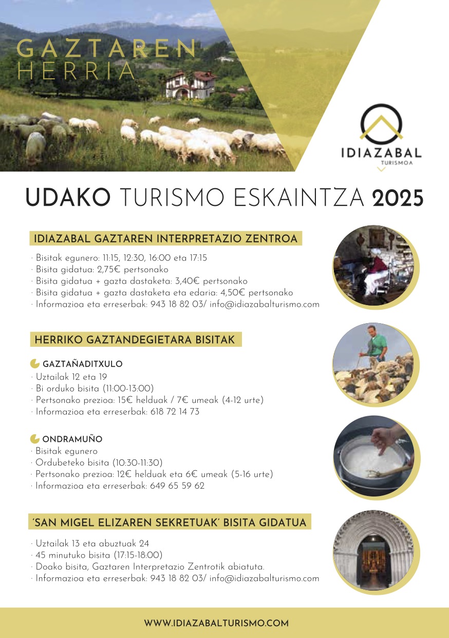 Hilaren hasieratik irailaren 15era bitartean, egunero irekiko ditu ateak, hain zuzen, Idiazabal Gaztaren interpretazio zentroak. Gainera, bisita gidatuak ere eskainiko ditu, goizean eta arratsaldean ondoko ordutegian: 11:00etan, 12:15ean, 16:00etan eta 17:15ean. Bisita egiteaz gain, gazta dastatzeko aukera ere egongo da. Bisitak egiteko aukera era prezio ezberdinak eskainiko ditu museoak: bisita gidatua 2,75 euro pertsonako; bisita gidatua eta gazta dastaketa 3,40 euro eta bisita gidatua gazta dastaketa eta edariarekin 4,50 euro. Informazio gehiagorako edo erreserbak egiteko 943 18 82 03 telefonora deitu edo info@idiazabalturismo.com helbidera idatzi daiteke.