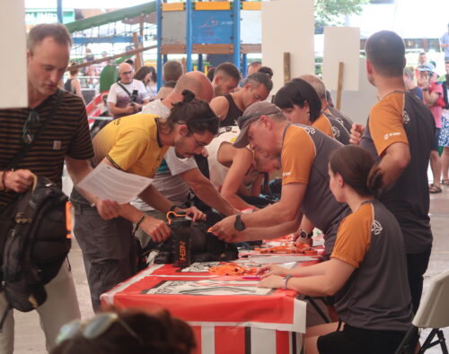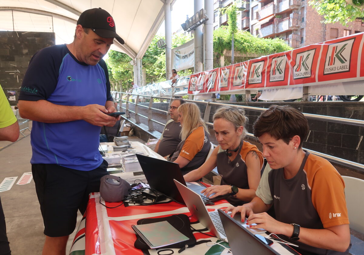 Ehunmiletako partaideak dortsalak jasotzen, Gernika pasealekuko gunean.Ariane Vierbücher