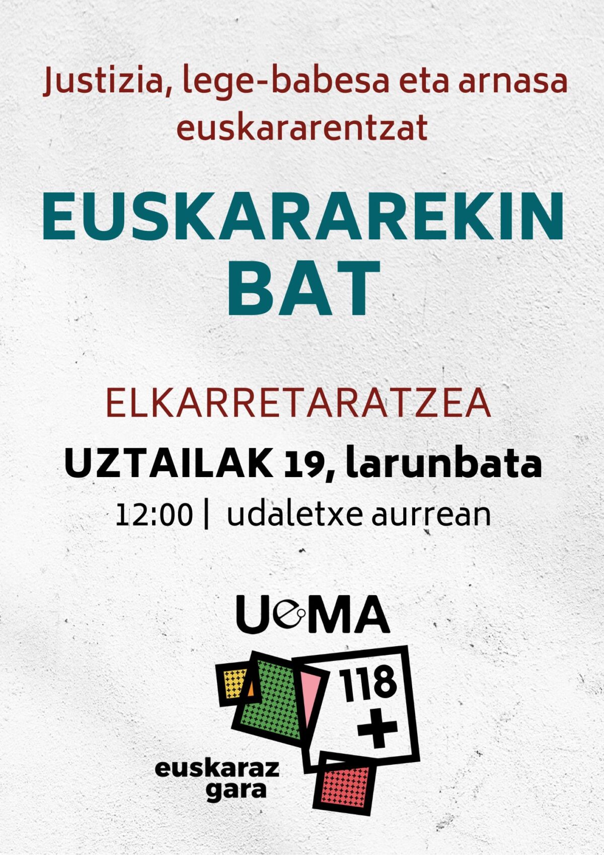 Era berean, UEMAko kide diren 118 udalei dei egiten diegu, epai hau salatzera eta euskaldunon eskubideen alde egitera kalera atera daitezen, Euskararekin bat lelopean, udaletxeen aurrean elkarretaratzeak eginez, larunbat honetan, uztailaren 19an, 12:00etan. Deialdi horiekin bat egitera deitzen ditugu euskalgintzako eragileak eta herritarrak ere.