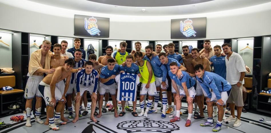 Partidaren amaieran taldeko argazkia atera zuten jokalariek aldageletan. Realeko gaur egungo jokalarien artean bederatzigarren jokalaria da Turrientes kopuru horretara iritsi dena.