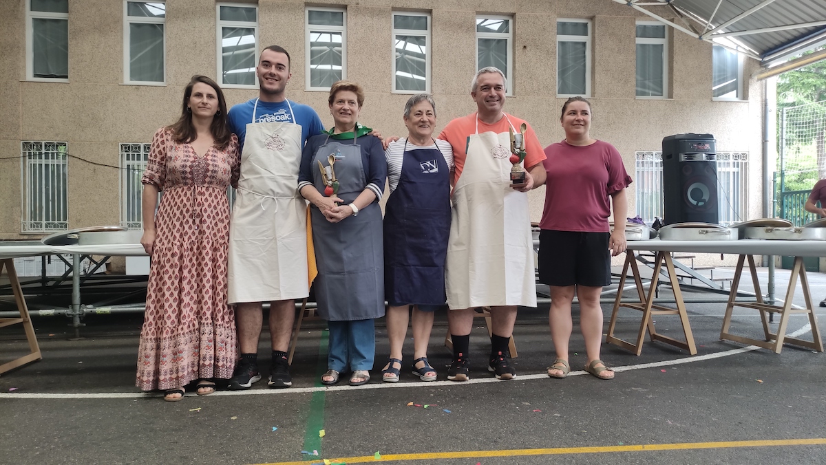 Behin sariak banatu eta taldeko argazkiak aterata, dozenaka herritar inguratu dira eskola patiora paella dastatu eta bazkari legea egitera.