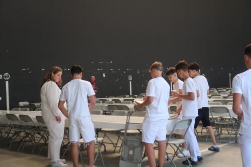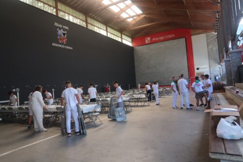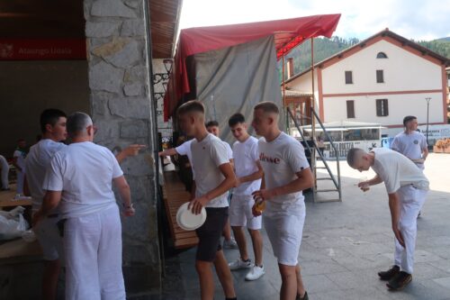 Gazte batzuk gaur eguerdian, kuadrilla bazkariaren aurretik pilotalekuan.Izaro Villarreal Hasi dira Ataungo San Gregorio auzoko jaiak. Atzo txupinazoarekin ekin zioten bost eguneko egitarauari. Gaur eguerdian kuadrillak txuriz jantzita atera dira kalera, eta kuadrillen bazkaria izan dute gero.
