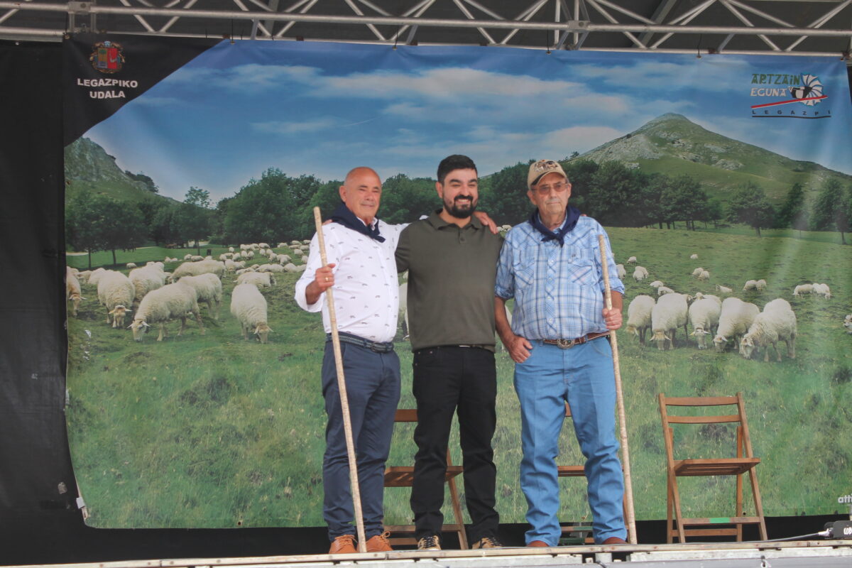 Jesus eta Florentino Goñi artzainak Legazpiko alkatearekin. Beste edizio batez, Gipuzkoako Artzain Eguna ospatzen ari dira Legazpin. Goizeko ekitaldiak plaza inguruan ospatu dira, Gipuzkoako Artzain Gaztaren 41. Lehiaketa, gazta eta sagardo dastaketa, 12 postuz osatutako artisauen azoka, Izaro Osinaldek gidatuko duen gaztagintza tailerra, Elustondo anai-arreben trikitixa eta Legazpiko Musika Bandaren doinuak, munduko txapelketara joango diren Ipar Arrinda eta Mikel Etxebarria ardi moztaileren erakustaldia, eta ardi erakusketa, horien artean.
