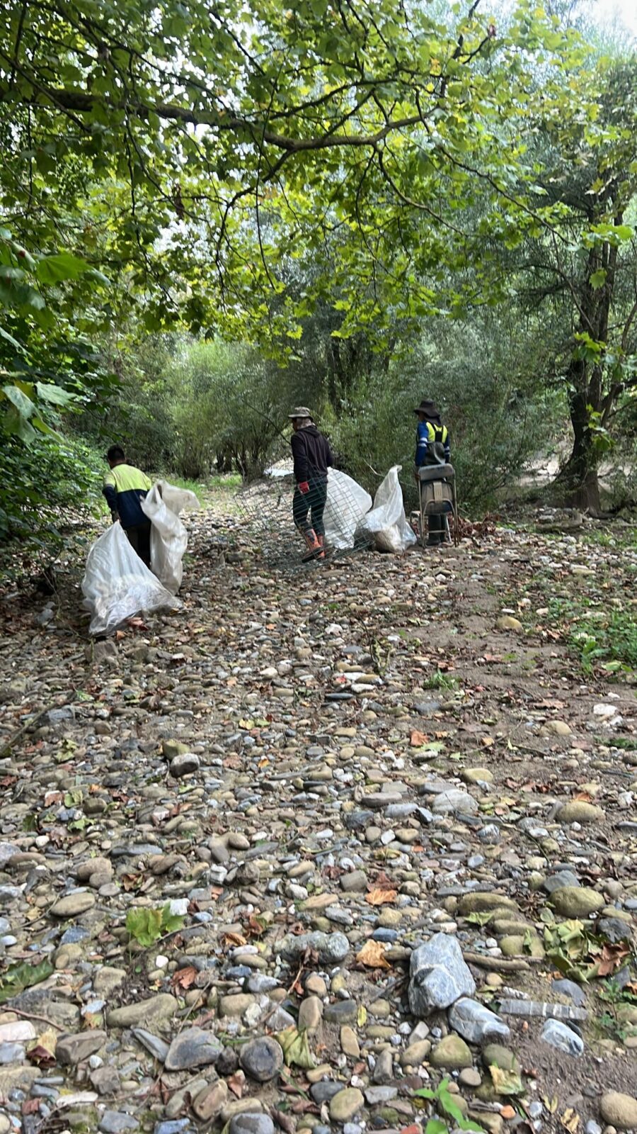 Ibai ertzean kateaturik dauden zaborrak eskuz biltzen dituzte, makinarik ez da erabiltzen, bertatik atera eta kamioian garbigunera eramaten dituzte, gero bertan sailkatuz eta pisatuz.