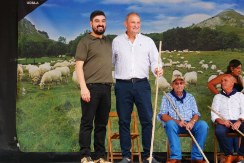 Artzain Eguneko omenaldian makila bat eman zion Otaegiri Eric Galvez Legazpiko alkateak. ARGAZKIA: Josu Altzelai/Legazpiko Udala