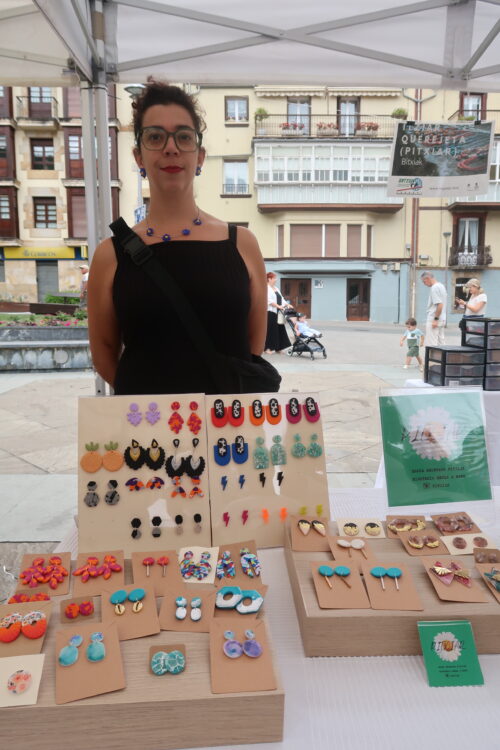 Itziar Kerejetak ere pitxiak egiten ditu, batez ere belarritakoak, baina beste material bat erabiltzen du, buztin polimerikoarekin. «Plastilina moduko bat da, forma ematen zaio, margoekin kolorea nahastu, eta labean, beroarekin gogortzen da materiala», azaldu du. Forma eta tamaina askotako belarritakoez gain, lepokoetan erabiltzeko piezak ere egiten ditu.
