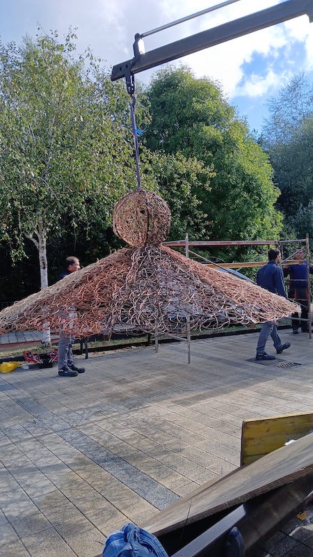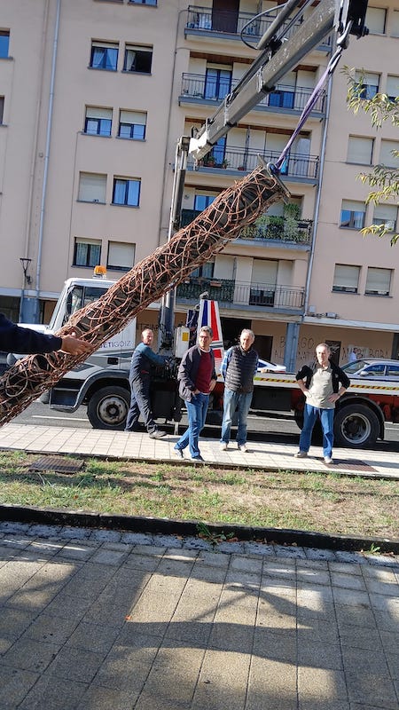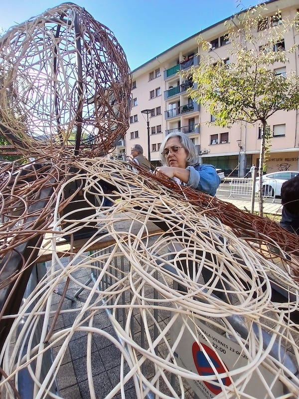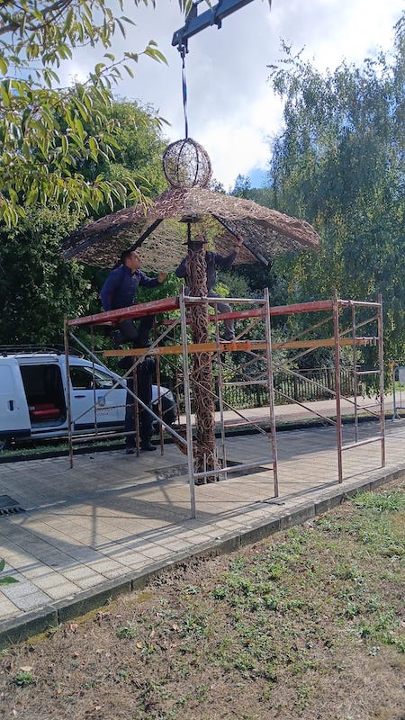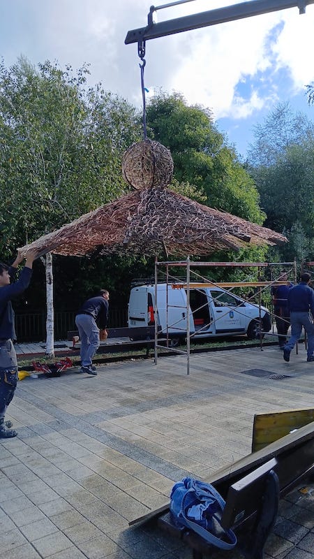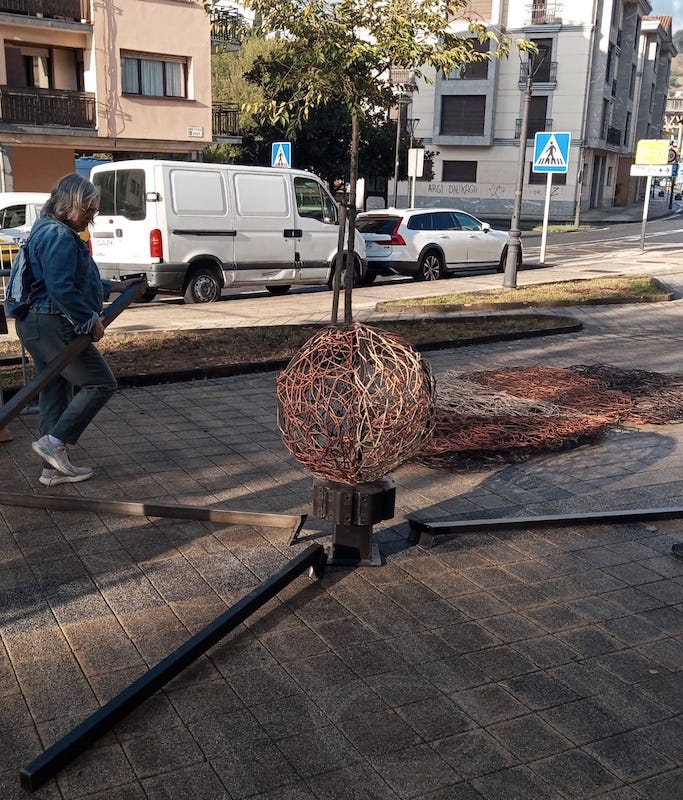 Zumitzez eta burdinez osatutako 3 metro eta erdiko altuera eta 2 metroko zabalera duen eskultura izan da emaitza, gaur goizen Ormaiztegiko Berjaldegi plazan kokatu dutena. Proiektua ibiltaria izan da eta bi urtetan zehar Ormaiztegin, Urretxun, Seguran, Beasainen eta Ordizian izan da “baztertze egoeran edo zailtasunak dituzten kolektiboekin lanean”. Elkarlanean osatu dituzte aterki erraldoi honen estalkia osatzen duten zumitzezko hirukiak, habiaren teknika erabilita.