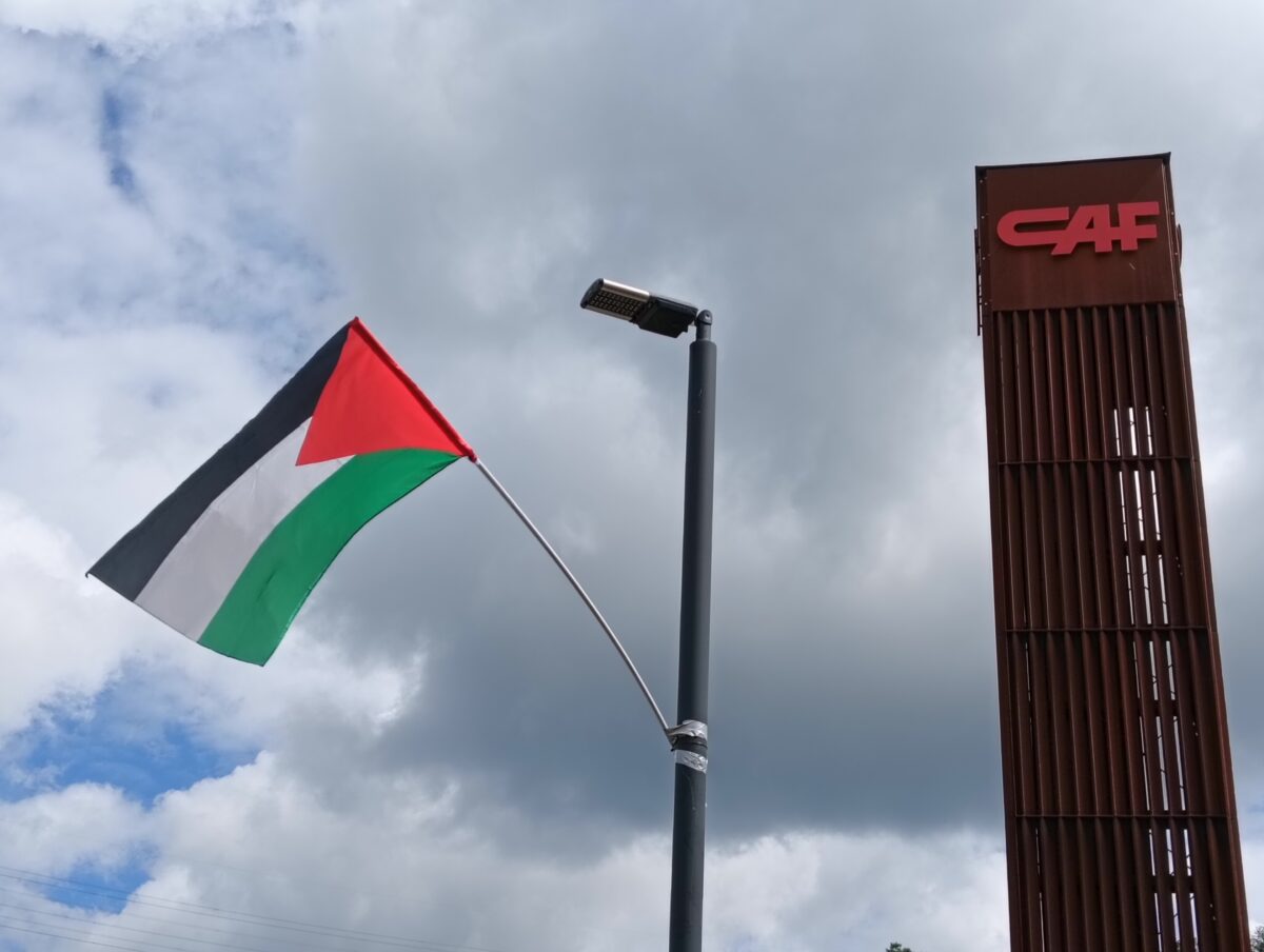 Palestinako bandera Beasaingo CAF lantegiaren atarian, protesta gisa.Tere Madinabeitia Espainiako Gobernuak joan den astean onartutako dekretuaren baitan, Kontsumo Ministerioak ikerketa abiatu du CAF eta Palestinako lurralde okupatuetan zerbitzuak eskaintzen dituzten gainerako enpresen gainean.