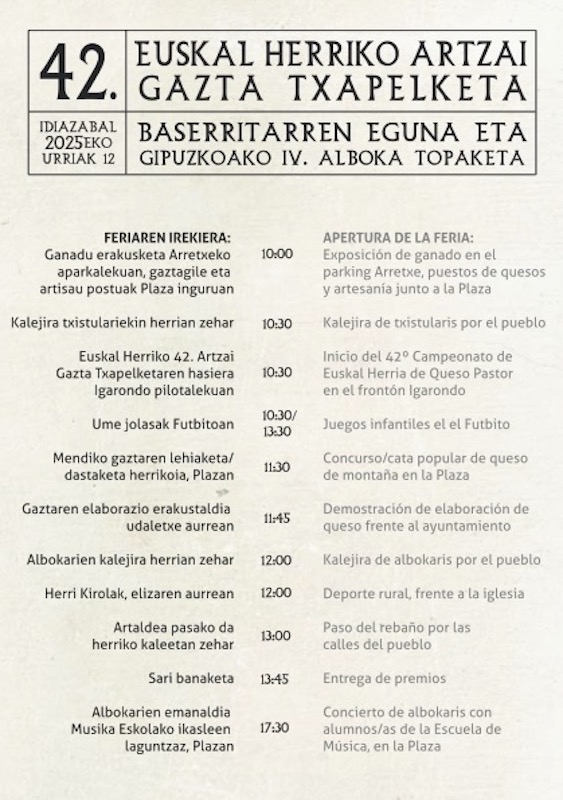 Artzai Gazta elkarteak antolatutako Euskal Herriko Artzain Gazta-Idiazabal Baserrikoa txapelketak sortuko du ikusmira gehien, urriaren 12an. Araba, Bizkaia, Gipuzkoa eta Nafarroako txapelketetan sailkapenik onenak lortutako gaztagileek hartzen dute parte beste behin; “40 bat gazta” izango dira lehian, Marta Perez Loperena Artzai Gazta elkarteko presidenteak zehaztu duenez. Elkarteko gaztagileentzat txapelketa hau “oso garrantzitsua” dela esan du. Txapelketa Igarondo pilotalekuan egingo dute 10:30etik aurrera. Sari banaketa ekitaldia 13:45 inguruan izango da.
