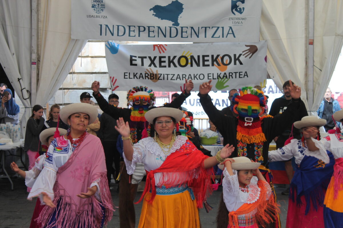 Ekuadorreko herritarrak dantzan. Festa betean dira zaldibiarrak. Gaur emango die amaiera jaien lehen asteburuari, baina hurrengo astean ere izango du jarraipena festak. Goizean zehar ekitaldi ugari egin dituzte: Aniztasunaren Jaia, Sega-Pikatze Txapelketa eta Maialen Lujanbio eta Unai Iturriaga bertsolarien saioa, besteak beste.